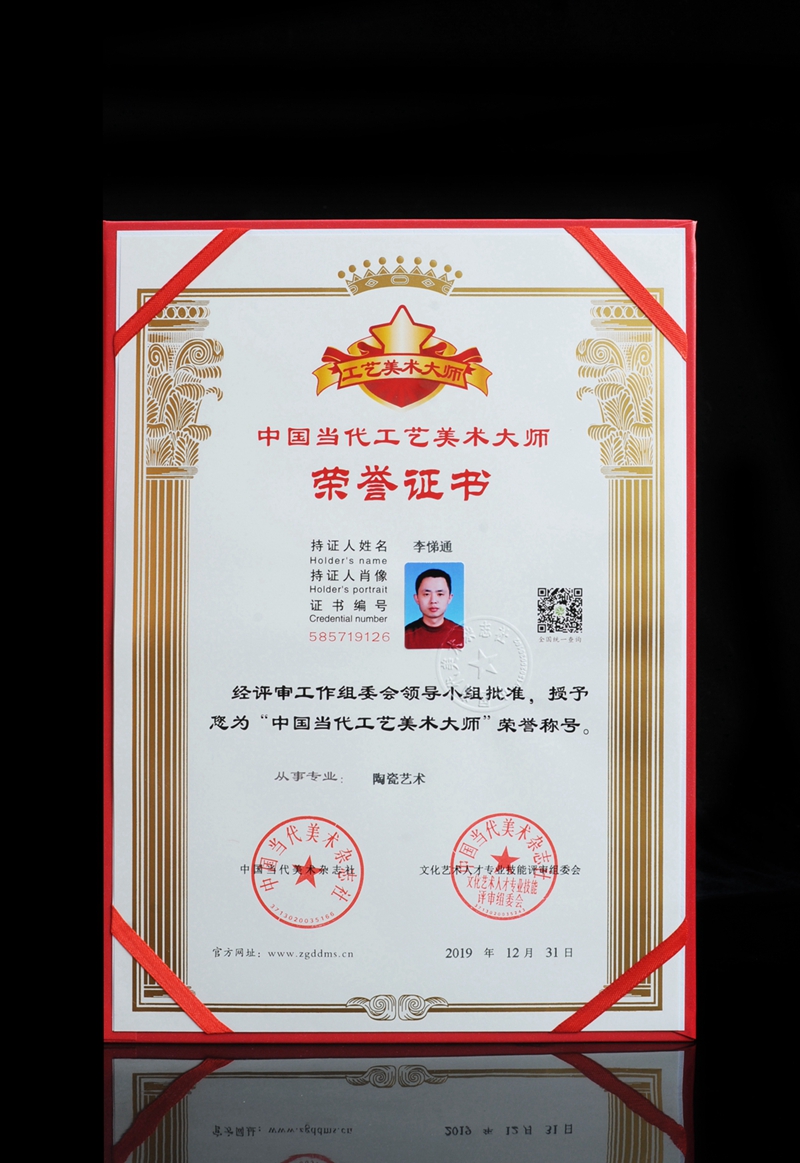國(guó)家一級(jí)技師,高級(jí)工藝美術(shù)師,中國(guó)陶瓷藝術(shù)非遺傳承人,中國(guó)當(dāng)代工藝美術(shù)大師,中國(guó)陶瓷藝術(shù)家。