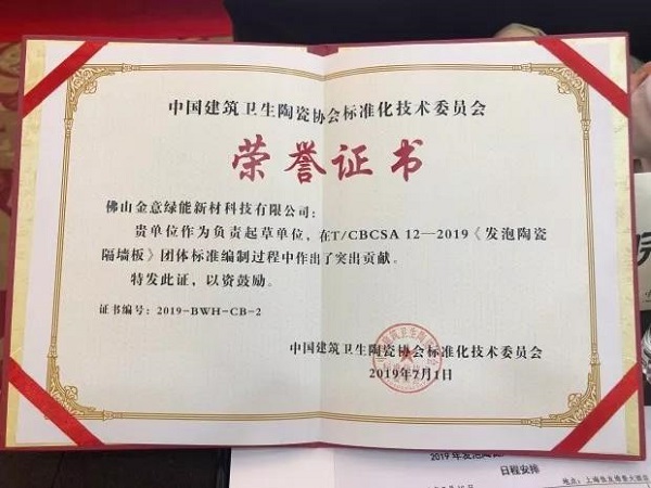 ▲金意陶綠能新材榮膺《發(fā)泡陶瓷隔墻板》標(biāo)準(zhǔn)參編單位之一