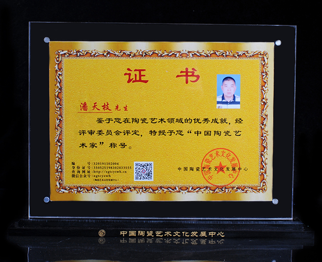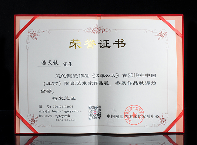 潘天枝從事陶瓷雕塑10多年,主要作品有觀音、彌勒、歷史人物,茶器等。作品多次獲得國內各評比大賽金獎,2019年獲評“中國陶瓷藝術家”,作品《義薄云天》榮獲2019年中國國際(北 京)陶瓷藝術名家精品展作品評比金獎等,其作品深受收藏家及有識之士青睞,廣受好評。
