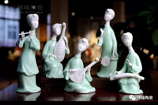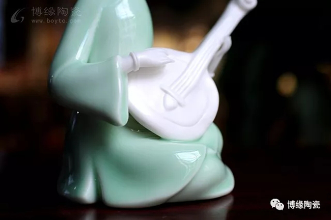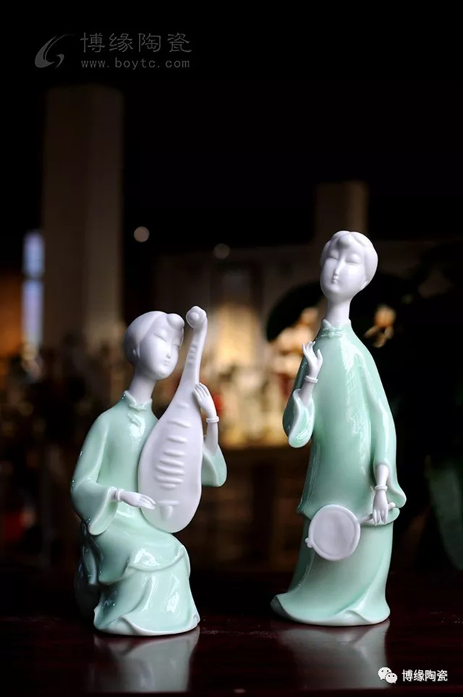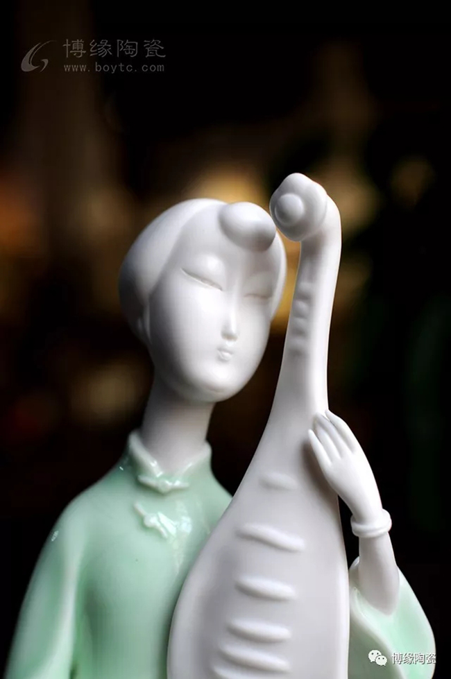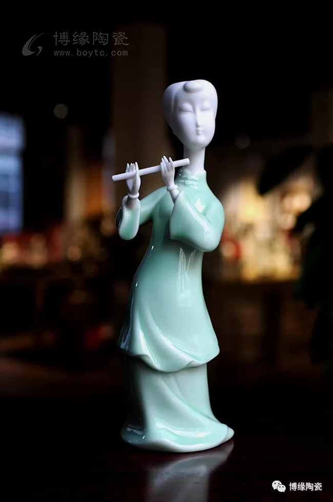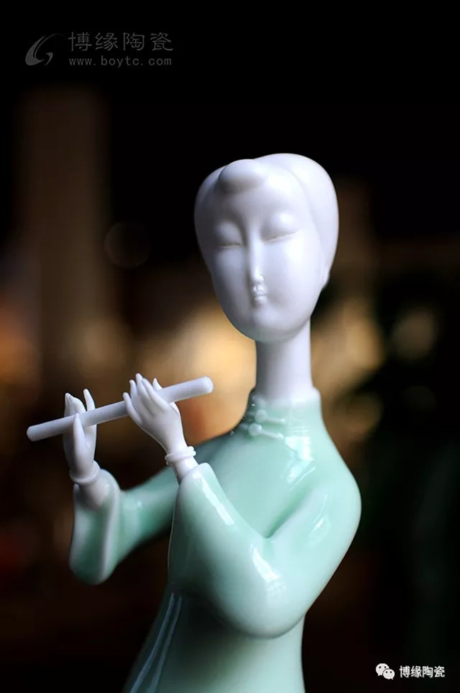 《中國舞音》以德化白瓷為底,梅子青釉為衣,氧化焰燒成溫度1310度。作品中五位女子著清代時期服飾,以琵琶,笛子,古琴,阮咸為樂,中間執(zhí)扇女子輕扭身肢,款款輕唱。以現(xiàn)代的創(chuàng)作手法及結(jié)合寫意的風格,再現(xiàn)那個時期中國歷史淵源的傳統(tǒng)舞蹈及詩詞音樂文化,及富庶的江南一片歌舞升平的繁華盛世。