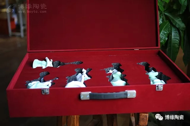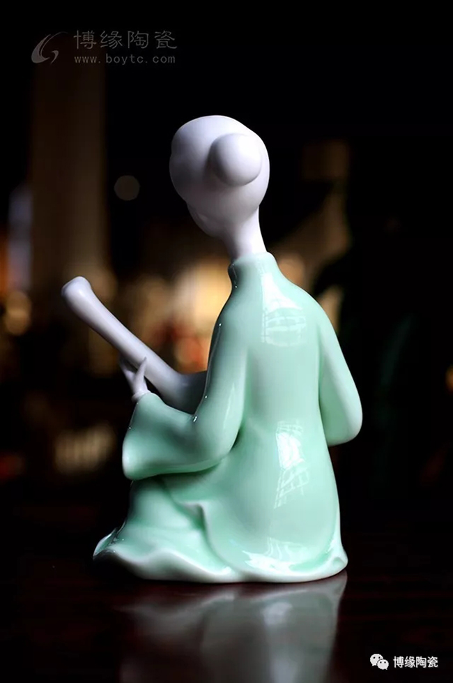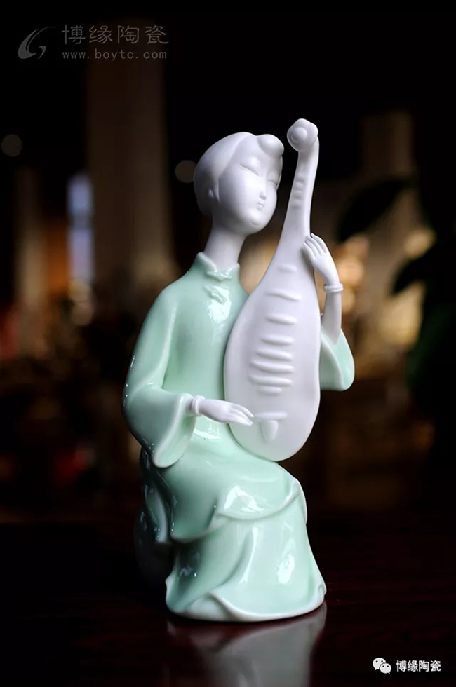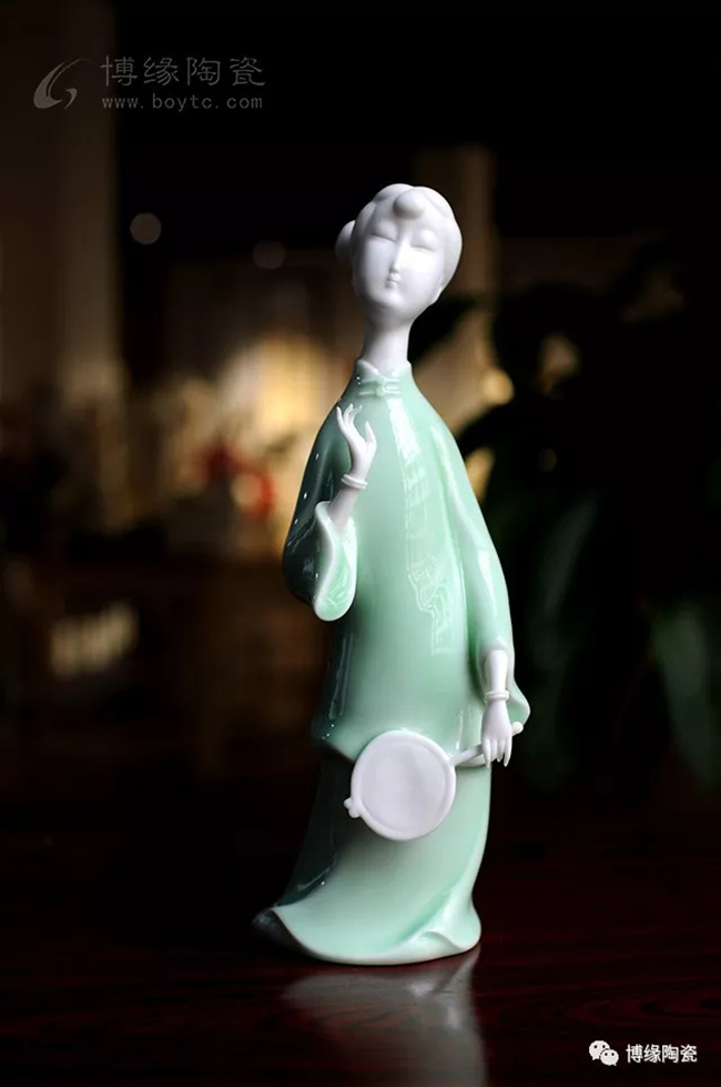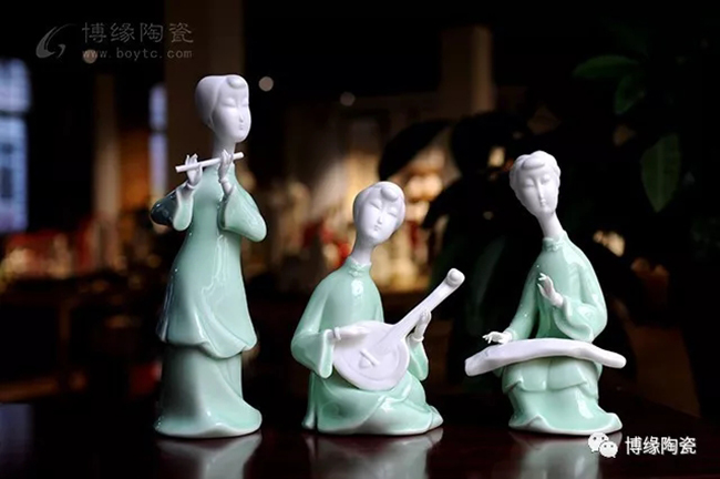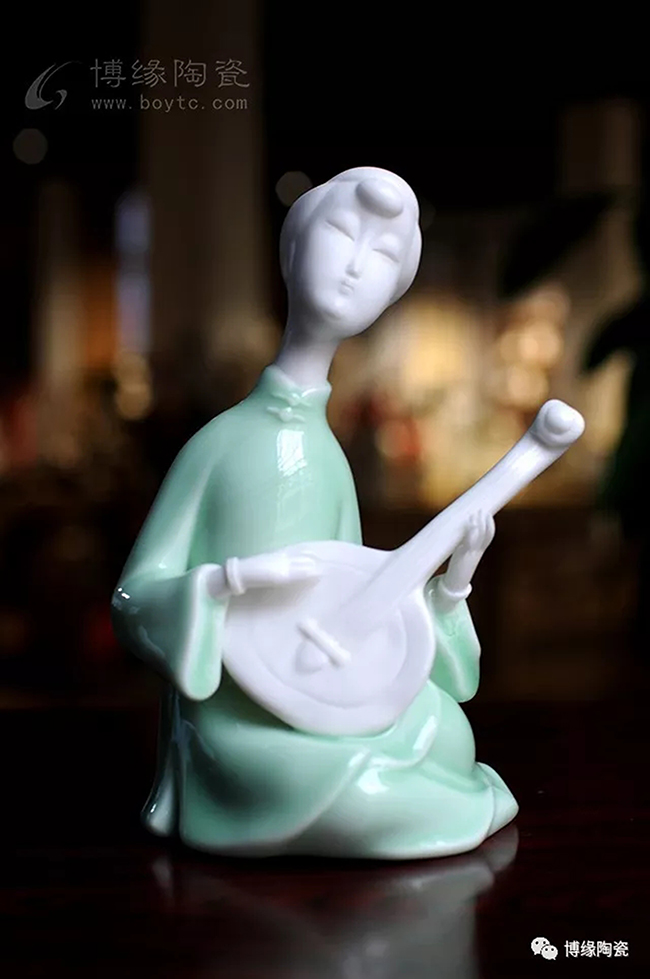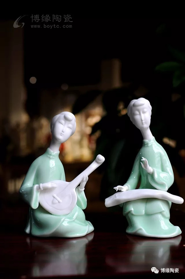 《中國舞音》以德化白瓷為底,梅子青釉為衣,氧化焰燒成溫度1310度。作品中五位女子著清代時期服飾,以琵琶,笛子,古琴,阮咸為樂,中間執(zhí)扇女子輕扭身肢,款款輕唱。以現(xiàn)代的創(chuàng)作手法及結(jié)合寫意的風格,再現(xiàn)那個時期中國歷史淵源的傳統(tǒng)舞蹈及詩詞音樂文化,及富庶的江南一片歌舞升平的繁華盛世。