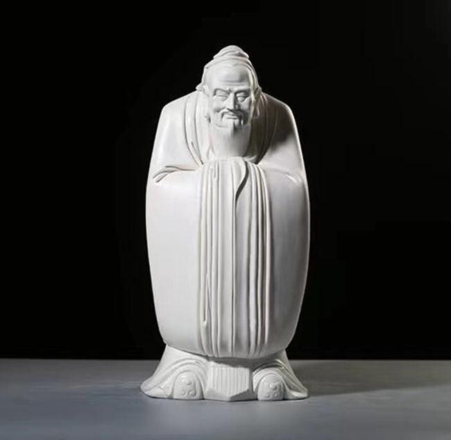 儒——《孔子》,中華文化思想的集大成者,儒家學(xué)說的創(chuàng)始人。作品主要表達(dá)了德侔天地,道貫古今的儒家精神。作品人物微傾的身軀,炯炯有神的雙眸,寬大的衣袖以儒家思想“仁義禮智信忠孝悌節(jié)恕勇讓”的篆體紋樣裝飾,給人一種追遠(yuǎn)崇敬之情。