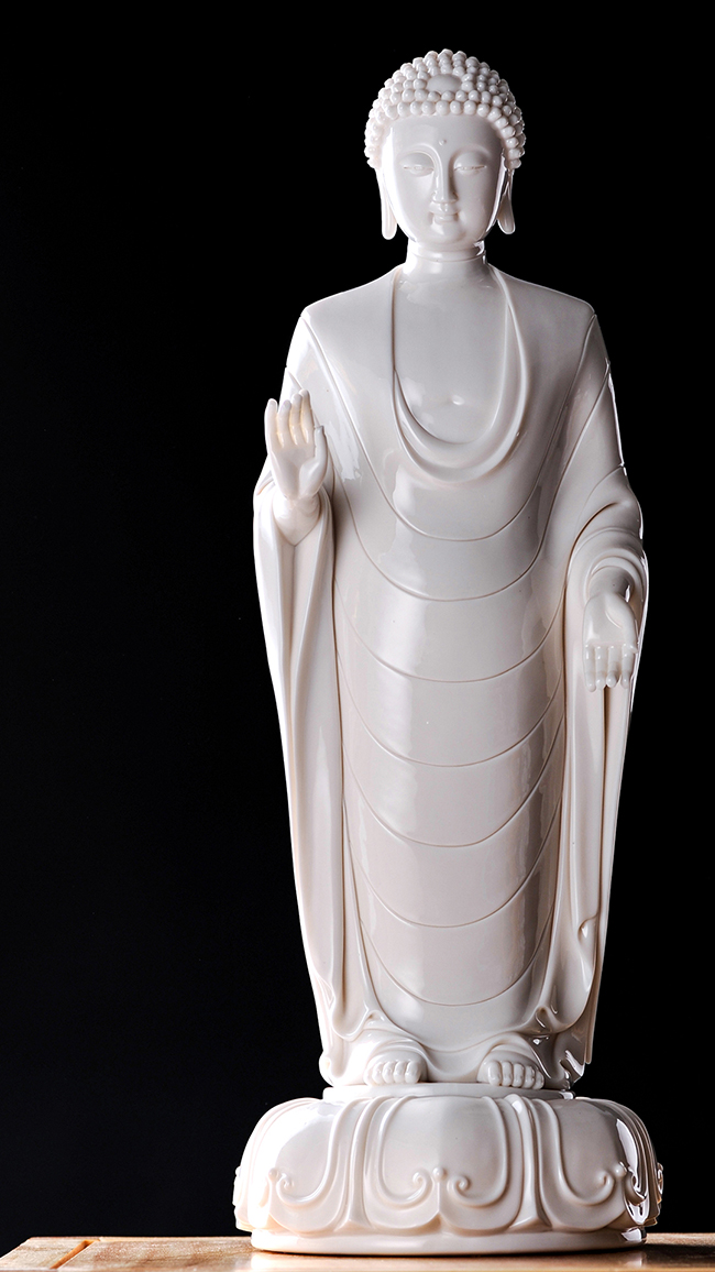 佛——《釋迦牟尼》,佛教的創(chuàng)立者及代表人物。作品著重塑造了華貴莊嚴(yán)、超凡脫俗的佛家境界。作品人物面頰豐滿,雙耳垂肩,慈悲的表情,似為蒼生祈福,站立狀的佛祖一手施“無畏印”狀,一手施“與愿印”狀,寬大的袈裟袖袍之上鐫刻了梵文《金剛經(jīng)》,帶給眾生心安和無畏。