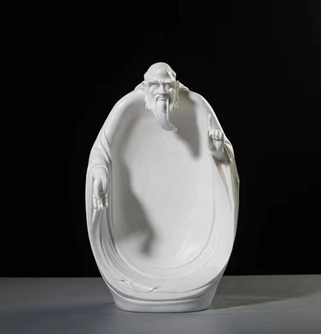 道——《老子》,道家?guī)熥。作品重在傳達(dá)一種脫塵出俗、仙風(fēng)道骨、遨游“無為”之境的道家氣韻。作品中蒼老而矍鑠的面部有一種感人的藝術(shù)力量,左手拇指和食指貼身上指,其余三指彎曲,右手攥著一卷竹簡,暗示“道生一,一生二,二生三,三生萬物”的思想哲理。作者巧妙地將道家“道法自然無為而治”的思想精髓,利用篆體變成一種紋飾刻畫在袖口之處。