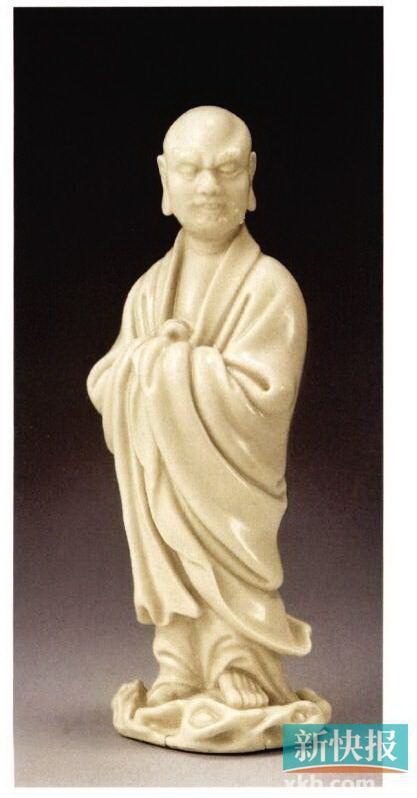 瓷塑達(dá)摩明清兩代均有作品,其造型有立像和坐像兩類,以立像者居多。達(dá)摩容貌威嚴(yán),身材偉岸,廣額深目,高鼻挺直,滿臉虬須,身穿袈裟,雙手?jǐn)n袖于胸前,赤足立于波濤之中,隨風(fēng)上下,御風(fēng)作渡海狀,衣褶旋回轉(zhuǎn)折,線條圓潤流暢,形象超凡絕塵,神采飛動。此器通體施白釉,釉質(zhì)肥厚滋潤,底部中空。整器造型比例恰當(dāng),人物刻畫形象生動。
