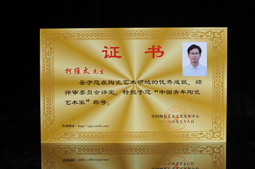 近日,中國青年陶瓷藝術(shù)家柯維太,通過了中國當代美術(shù)專業(yè)藝術(shù)測評委員會評測,榮獲“高級工藝美術(shù)師”。