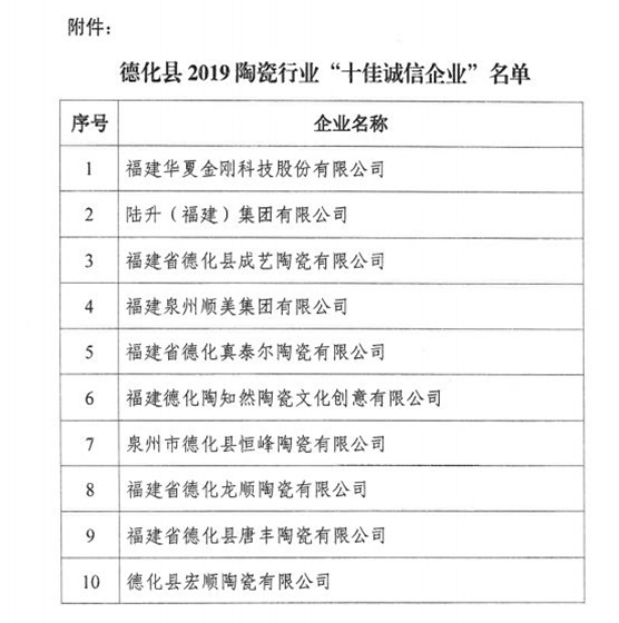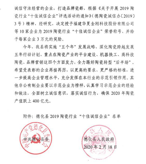 為加快打造海絲路上具有國際影響力的現(xiàn)代化世界陶瓷之都,縣委、縣政府大力實施“七大提升行動”、“三五三”發(fā)展戰(zhàn)略和《德化陶瓷產(chǎn)業(yè)跨越發(fā)展五年行動計劃(2018-2022)》,先后出臺《大力加強陶瓷行業(yè)誠信建設(shè) 打響“世界陶瓷之都”品牌的實施意見》和《德化縣陶瓷行業(yè)市場秩序?qū)m椪螌嵤┓桨浮,通過開展一系列陶瓷行業(yè)經(jīng)營失信行為的專項整治,陶瓷市場競爭秩序日趨有序、規(guī)范,為我縣陶瓷行業(yè)營造了良好的發(fā)展環(huán)境。為了樹立正確的行為導(dǎo)向,表彰在陶瓷行業(yè)誠信建設(shè)中誠信守法經(jīng)營的企業(yè),打造品牌瓷都,根據(jù)《關(guān)于開展2019陶瓷行業(yè)“十佳誠信企業(yè)”評選活動的通知》(德陶瓷誠信辦〔2019〕3號)精神,經(jīng)研究,決定授予福建華夏金剛科技股份有限公司等10家企業(yè)為2019陶瓷行業(yè)“十佳誠信企業(yè)”榮譽稱號,并給予每家企業(yè)3萬元的獎勵。