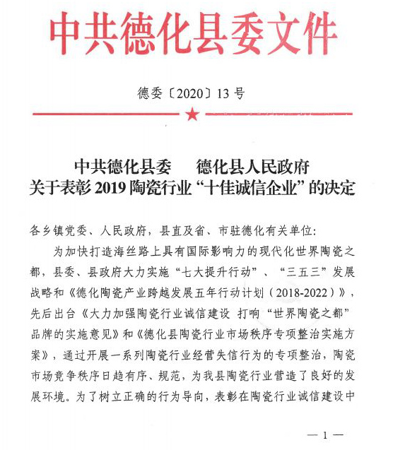 2020年這個春節(jié)注定是不平凡的,“不出門、戴口罩、勤洗手、不聚集”是這個春節(jié)的高頻詞,在大家一手抓防控新冠疫情一手抓復(fù)工復(fù)產(chǎn)的關(guān)鍵時刻,縣委縣政府作出了表彰2019陶瓷行業(yè)“十佳誠信企業(yè)”的決定,給我們化危為機、做好企業(yè)工作注入了動力、增強了信心。讓我們來看一下表彰決定的內(nèi)容吧!