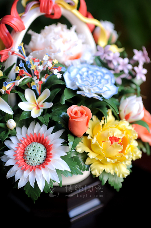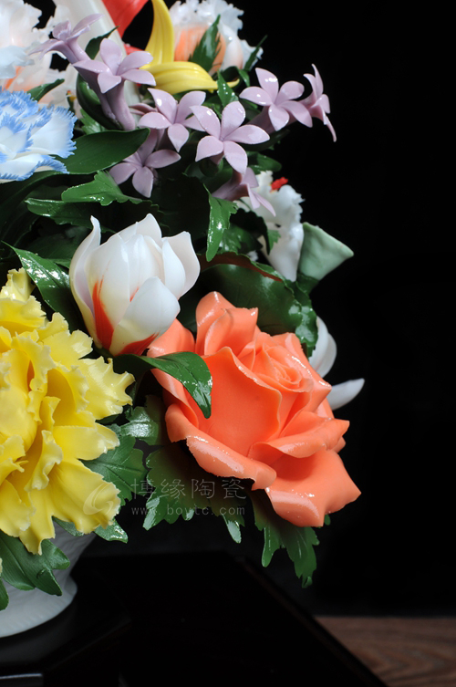 作品沿用德化傳統(tǒng)的制瓷技法“捏、塑、雕、鏤、貼、接、推、修,作品集合牡丹、玫瑰、菊花等盡顯出百花爭艷的姿態(tài),呈現(xiàn)出花開富貴的一番景象,瓷花純手工捏制,細膩精致、以假亂真。體現(xiàn)出創(chuàng)作者匠心獨具。