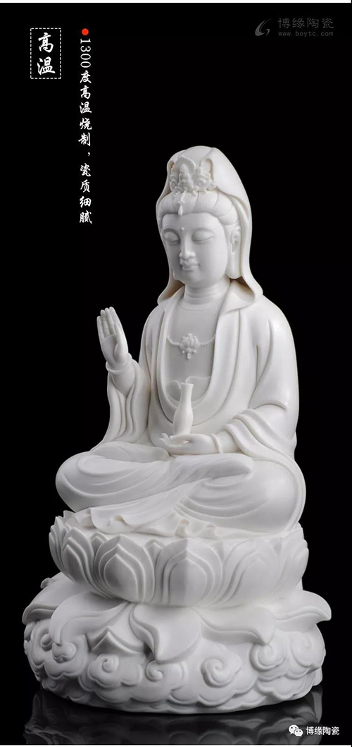《坐蓮觀世音菩薩》以徳化白瓷カ胎貭,觀音坐于蓮花之上,左手持瓶,圜劭有カ如凝脂似玉,滋洞萓滑。銭條清晰、筒浩、瀟灑,多変化,柔媚流暢,翻裝自然,神情嫻雅平靜,安洋自若,雙目低垂凝思。面部刻刻細膩,衣紋則深而洗蘇,主次分明,作品結(jié)合古典及現(xiàn)代家居美一體。