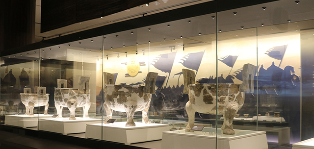 商代的陶器前后差別較大,早期的陶器,以泥質(zhì)灰陶為主,而中晚期的陶器,以泥質(zhì)灰陶和夾砂灰陶為最多,另有少量的泥質(zhì)紅陶。古齊廳中展示了商代的飲酒器陶觚,以及樸素的煮飯器具陶鬲,見微知著,透過(guò)展品,商朝的社會(huì)風(fēng)貌可見一斑。