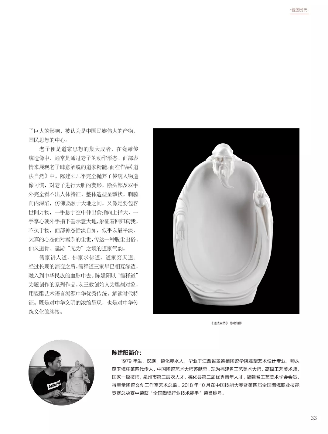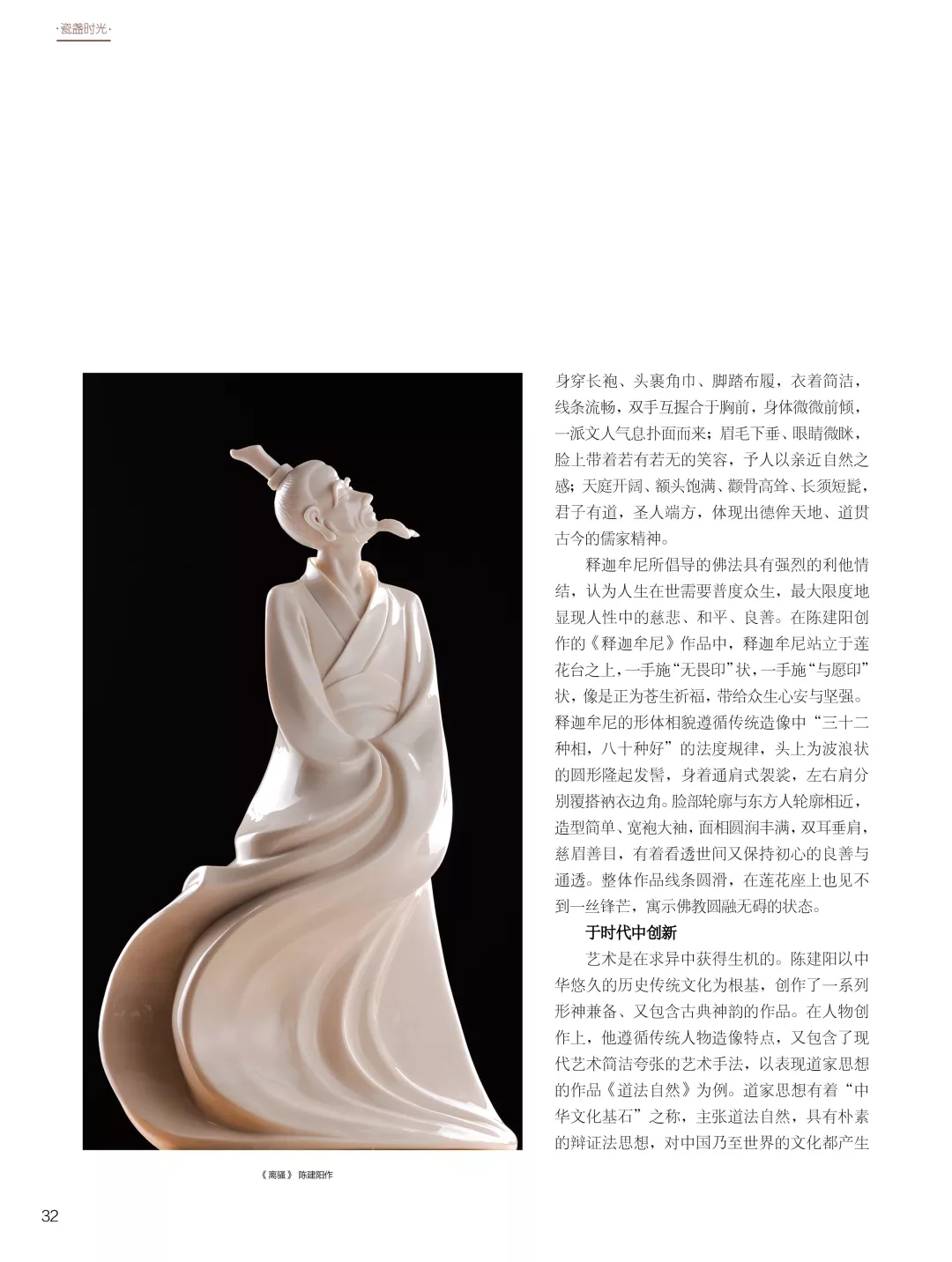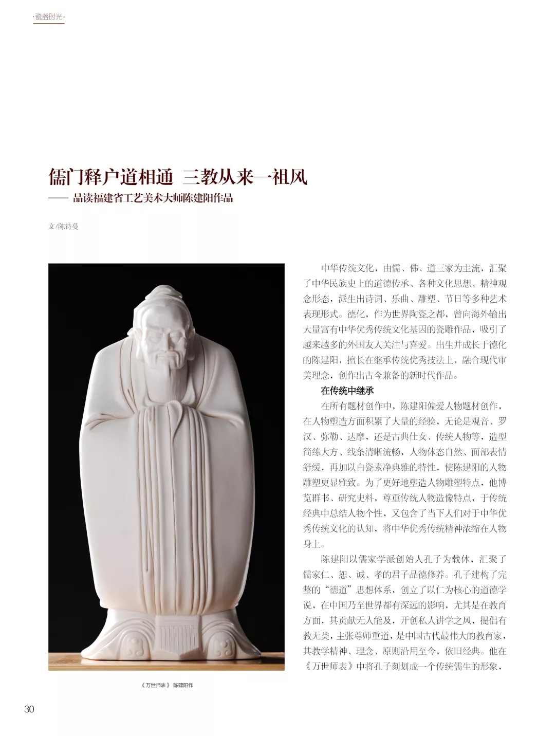 中華傳統(tǒng)文化,由儒、佛、道三家為主流,匯聚了中華民族史上的道德傳承、各種文化思想、精神觀(guān)念形態(tài),派生出詩(shī)詞、樂(lè)曲、雕塑、節(jié)日等多種藝術(shù)表現(xiàn)形式。德化,作為世界陶瓷之都,曾向海外輸出大量富有中華優(yōu)秀傳統(tǒng)文化基因的瓷雕作品,吸引了越來(lái)越多的外國(guó)友人關(guān)注與喜愛(ài)。出生并成長(zhǎng)于德化的陳建陽(yáng),擅長(zhǎng)在繼承傳統(tǒng)優(yōu)秀技法上,融合現(xiàn)代審美理念,創(chuàng)作出古今兼?zhèn)涞男聲r(shí)代作品。
