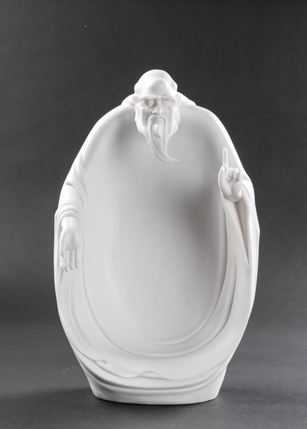 老子便是道家思想的集大成者,在瓷雕傳統(tǒng)造像中,通常是通過(guò)老子的動(dòng)作形態(tài)、面部表情來(lái)展現(xiàn)老子肆意灑脫的道家精髓。而在作品《道法自然》中,陳建陽(yáng)幾乎完全拋棄了傳統(tǒng)人物造像習(xí)慣,對(duì)老子進(jìn)行大膽的變形,除頭部及雙手外完全看不出人體特征,整體造型呈瓢狀,胸膛向內(nèi)深陷,仿佛要融于天地之間,又像是要包容世間萬(wàn)物,一手懸于空中伸出食指向上指天,一手掌心朝外手指下垂示意大地,象征著回歸真我,不執(zhí)于物,面部神態(tài)恬淡自如,似乎以最平淡、天真的心態(tài)面對(duì)囂雜的塵世,傳達(dá)一種脫塵出俗、仙風(fēng)道骨、遨游“無(wú)為”之境的道家氣韻。