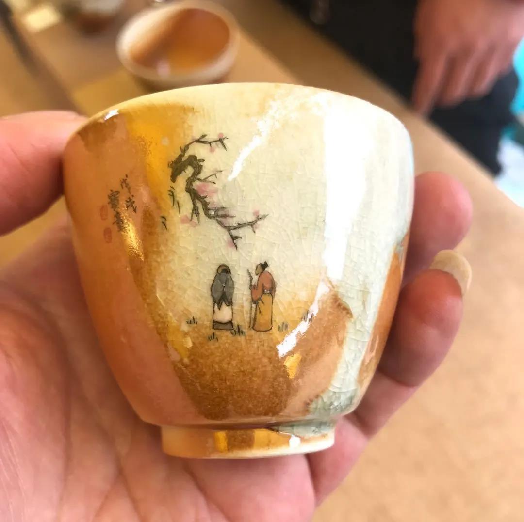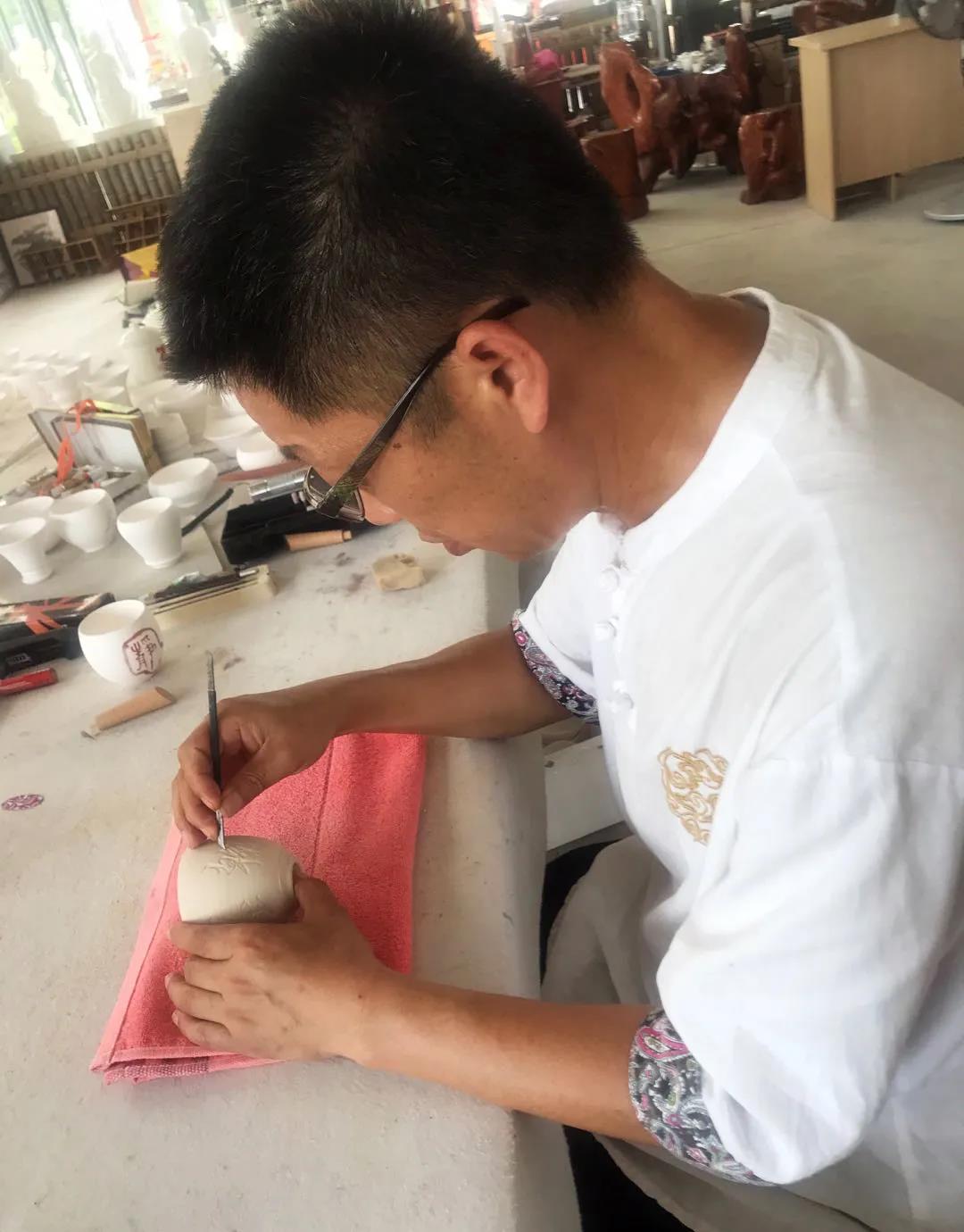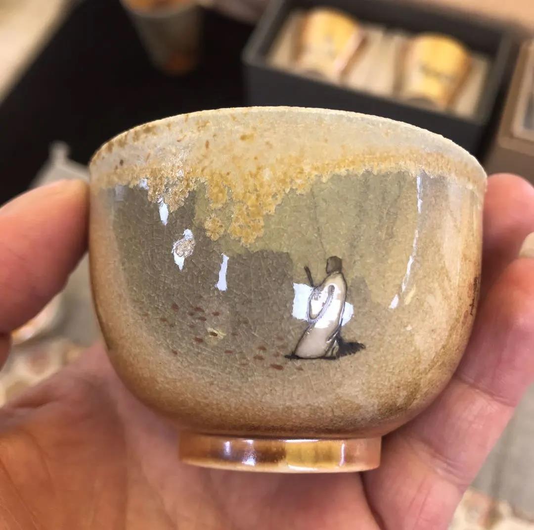 在這里,筆者看到了張移峰與眾不同的柴燒。除了火痕、落灰、釉面變幻這些共性,筆者關(guān)注到這里的柴燒多了一縷詩情畫意,器皿上一幅幅別出心裁的小畫讓古樸的作品多了別樣的風(fēng)情。在柴燒器皿上作畫,張移峰是德化第一人,這也成為他獨(dú)特的標(biāo)簽。