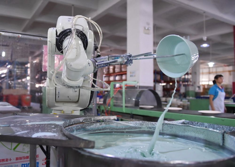 2019年10月11日,在位于德化縣的一公司生產(chǎn)車間,自動化上釉“機械臂”進(jìn)行上釉工序。(記者林善傳 攝)