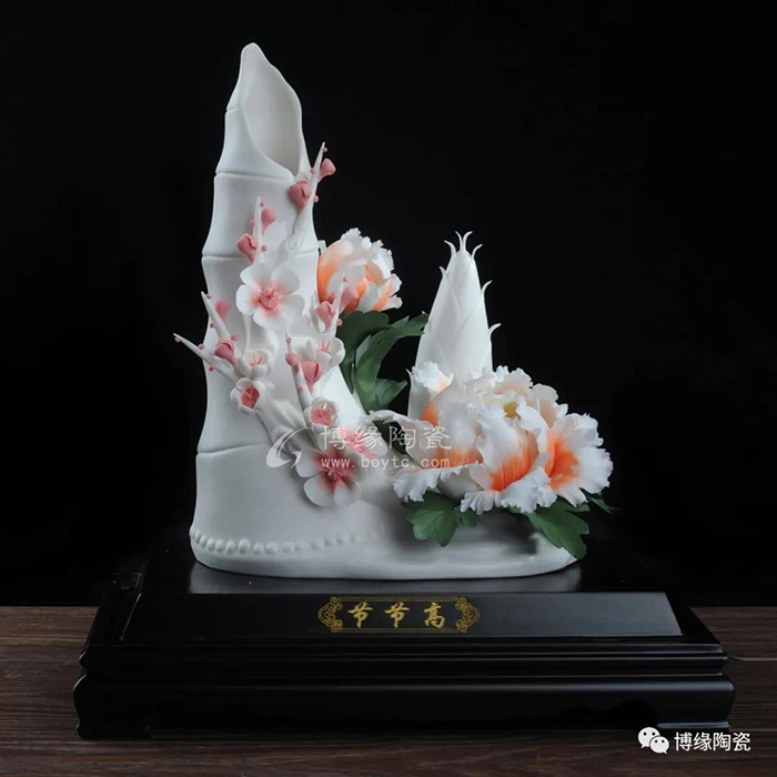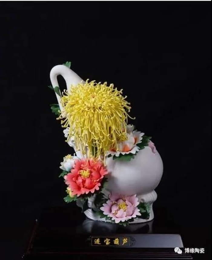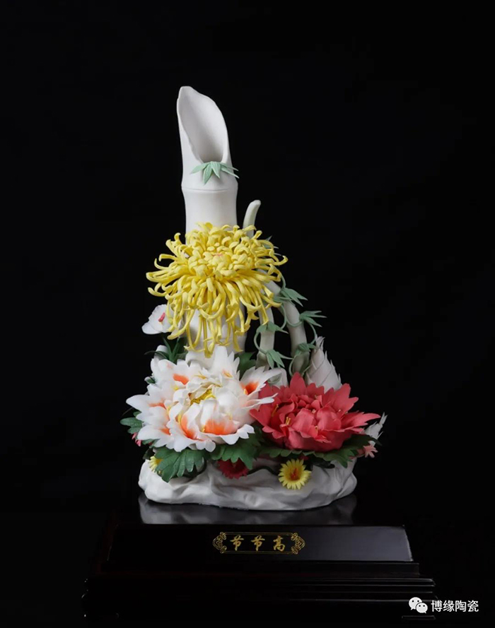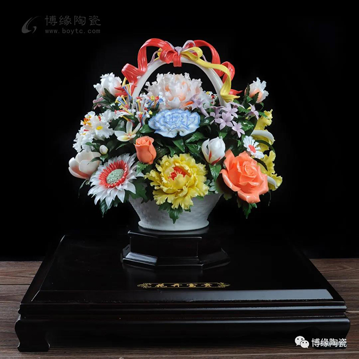 瓷花受到工藝的制約,單純的花卉造型過于簡(jiǎn)單,沒有文化內(nèi)涵,瓷花作品通常與花籃的籃形、掛盤、瓶類,假山,如玉、竹筍其他植物等其它器物造型結(jié)合,來表現(xiàn)一個(gè)主題。