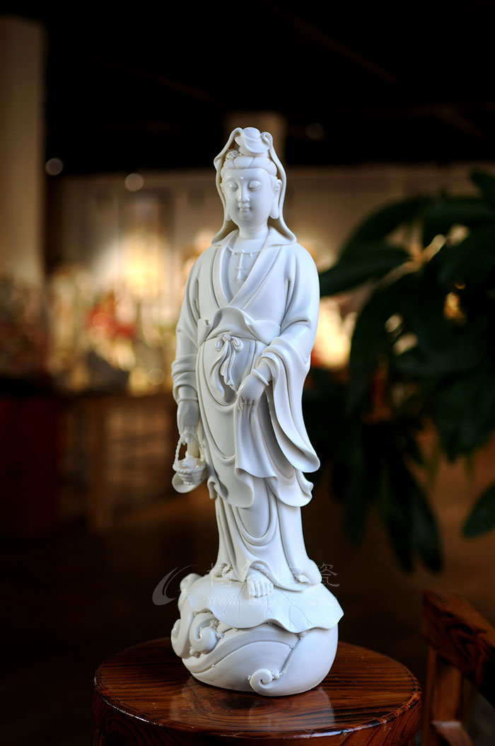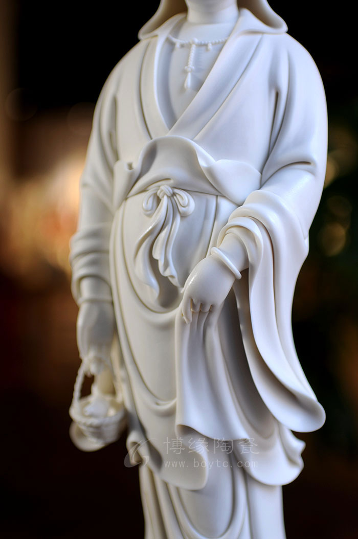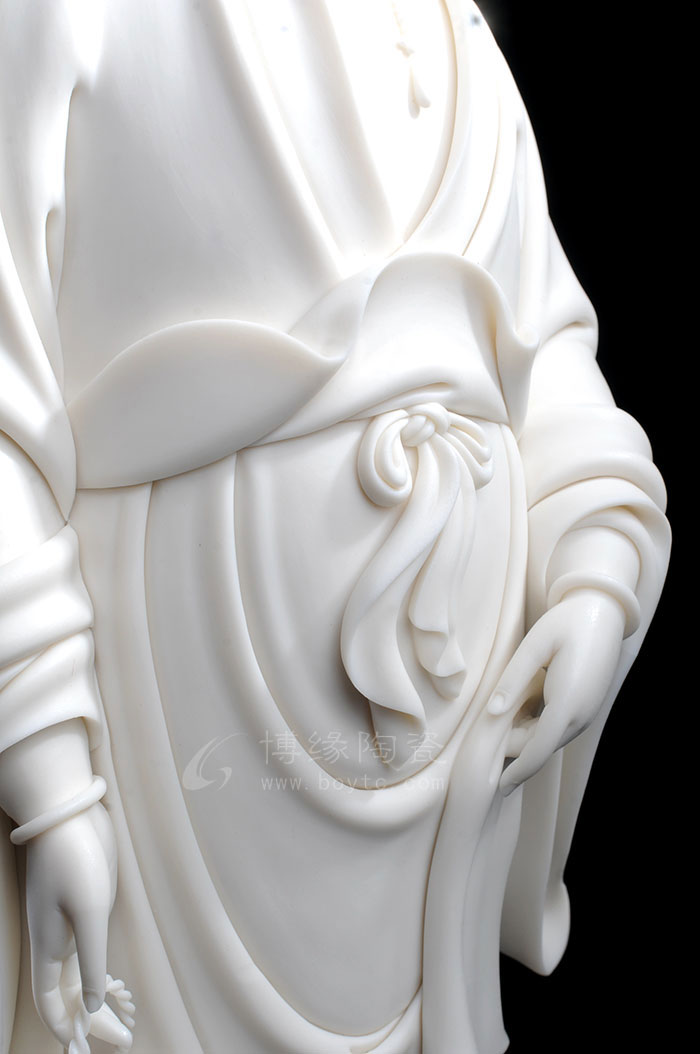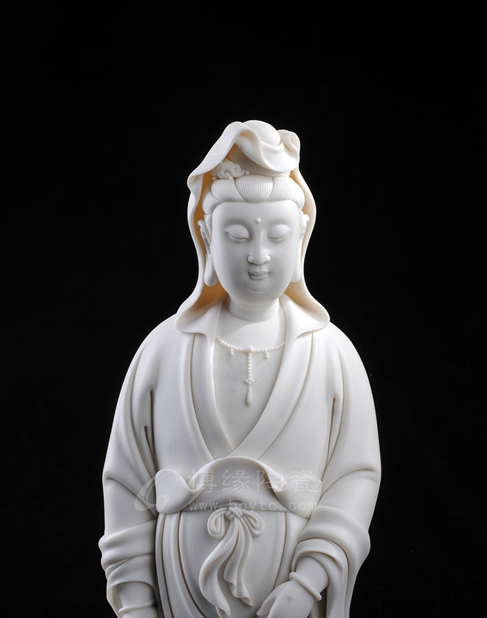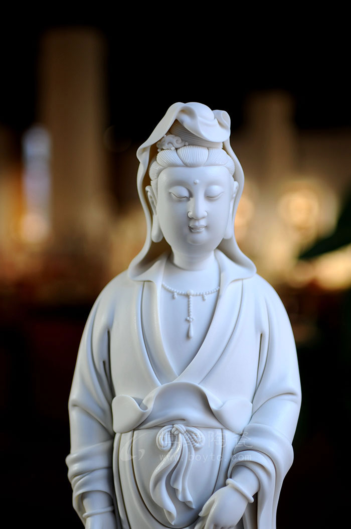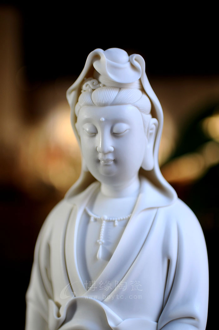 德化瓷器,以白瓷為最;白瓷之中,又以佛像為最。德化白瓷所塑佛像有性格鮮明、造型優(yōu)美、神態(tài)逼真、風(fēng)格洗練的特點(diǎn)。有一種單純的雕塑美和原材料的質(zhì)地美,最能體現(xiàn)佛教樸素、平和的思想。