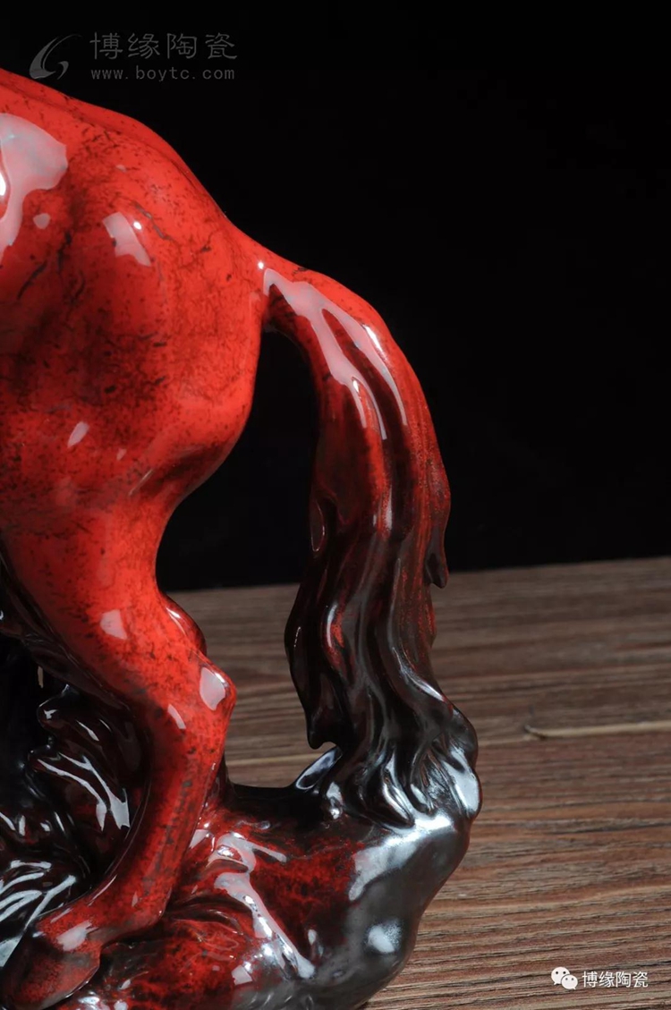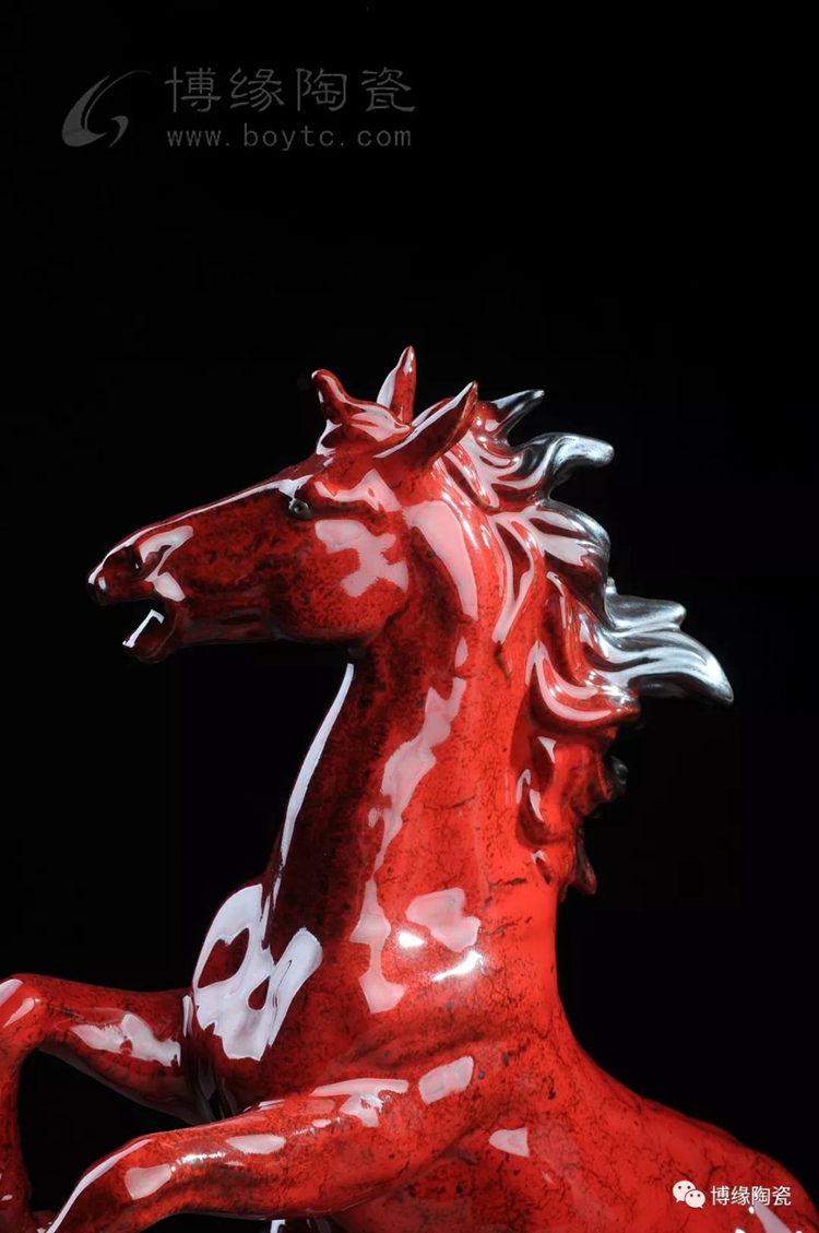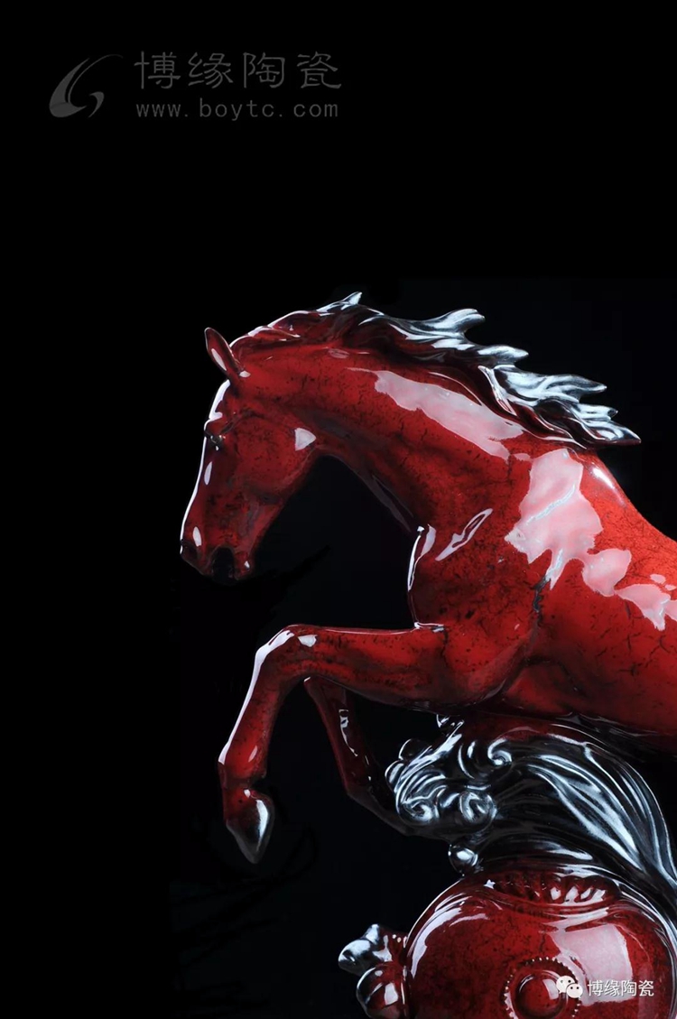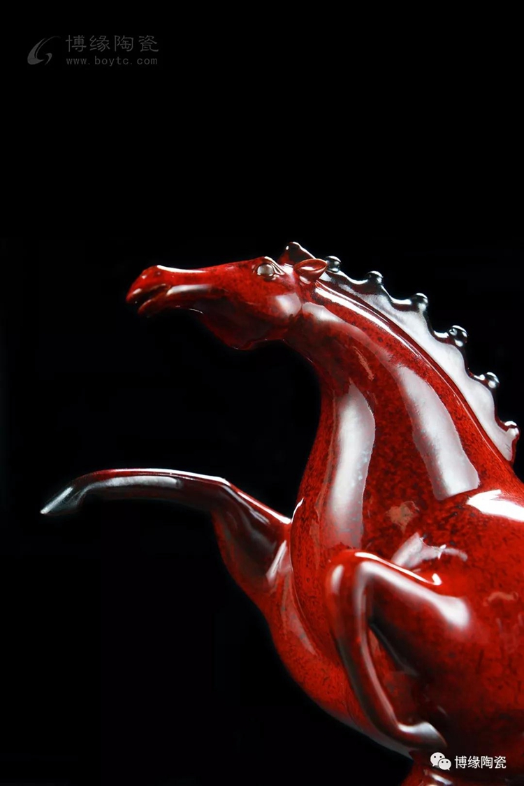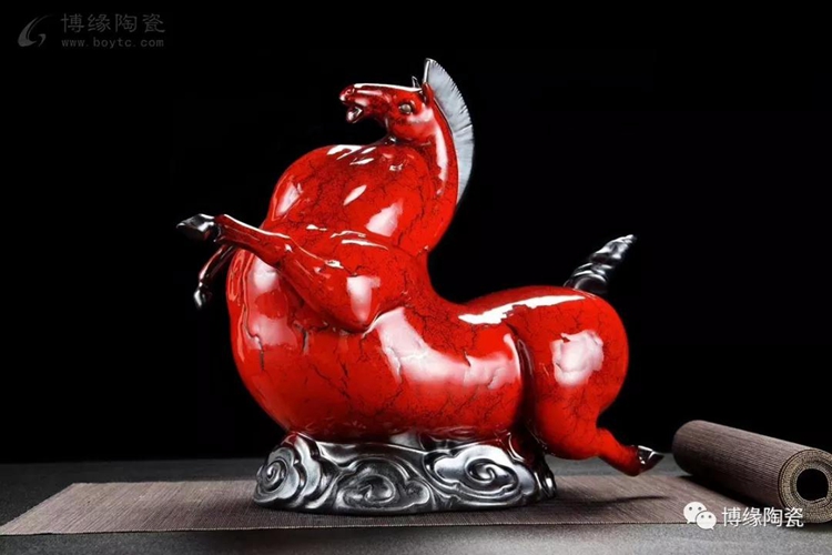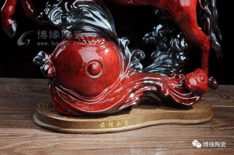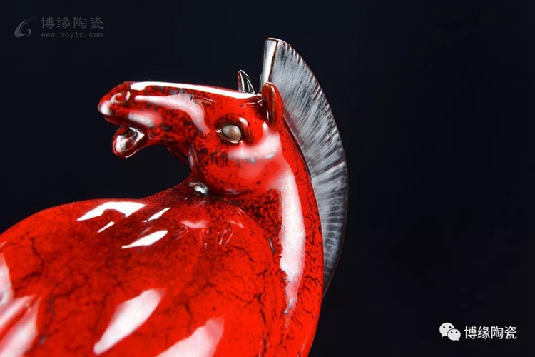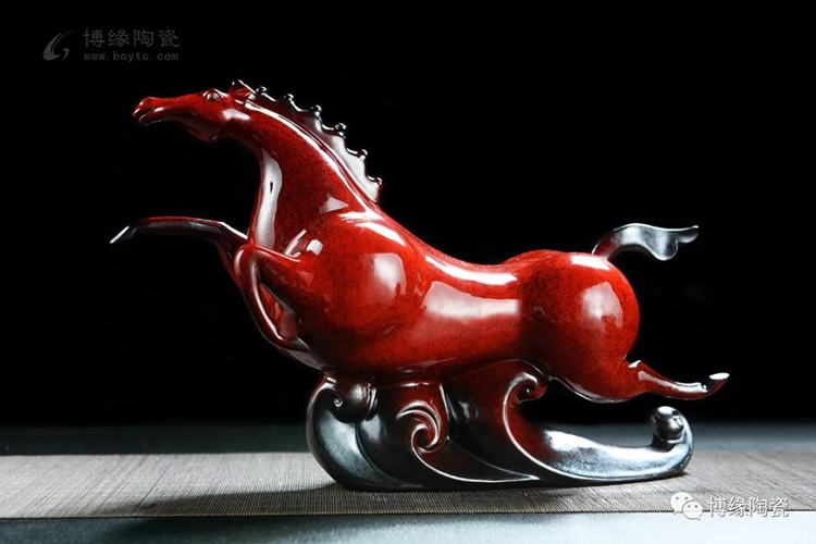 《前程如意》、《唐馬》、《立馬成功》、《馬踏飛燕》、《踏浪天馬》作品采用烈焰紅釉經(jīng)1300多度高溫?zé),產(chǎn)生窯變效果,釉面鮮艷、喜慶。所塑駿馬精神抖擻,身強(qiáng)力壯,有的兩只前蹄騰空躍起,威風(fēng)凜凜,鬃毛隨風(fēng)擺動,極富動感。在皮膚下面, 是熱血奔涌的血管,進(jìn)而是塊狀的肌肉與健壯的骨架,馬的蹄、鬢毛、眼神、耳朵、乃至鼻息,都傳遞出 濃烈的信息,具有很強(qiáng)的藝術(shù)感染力。