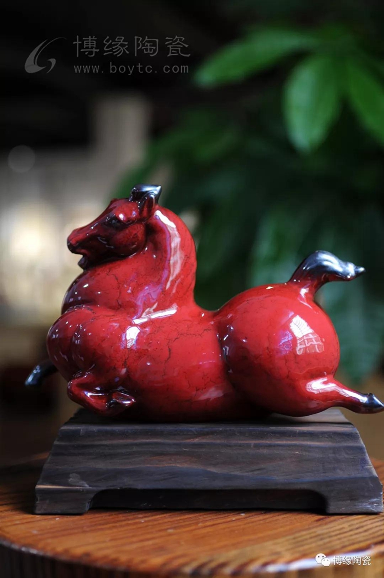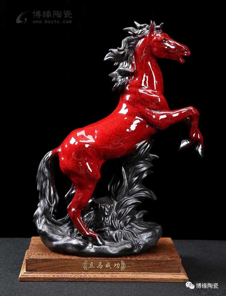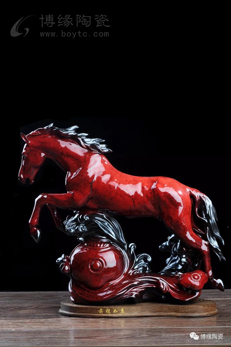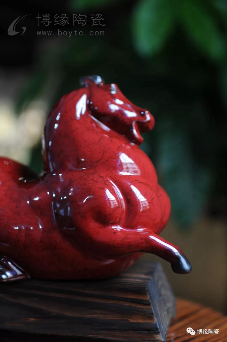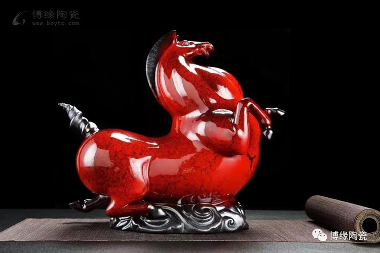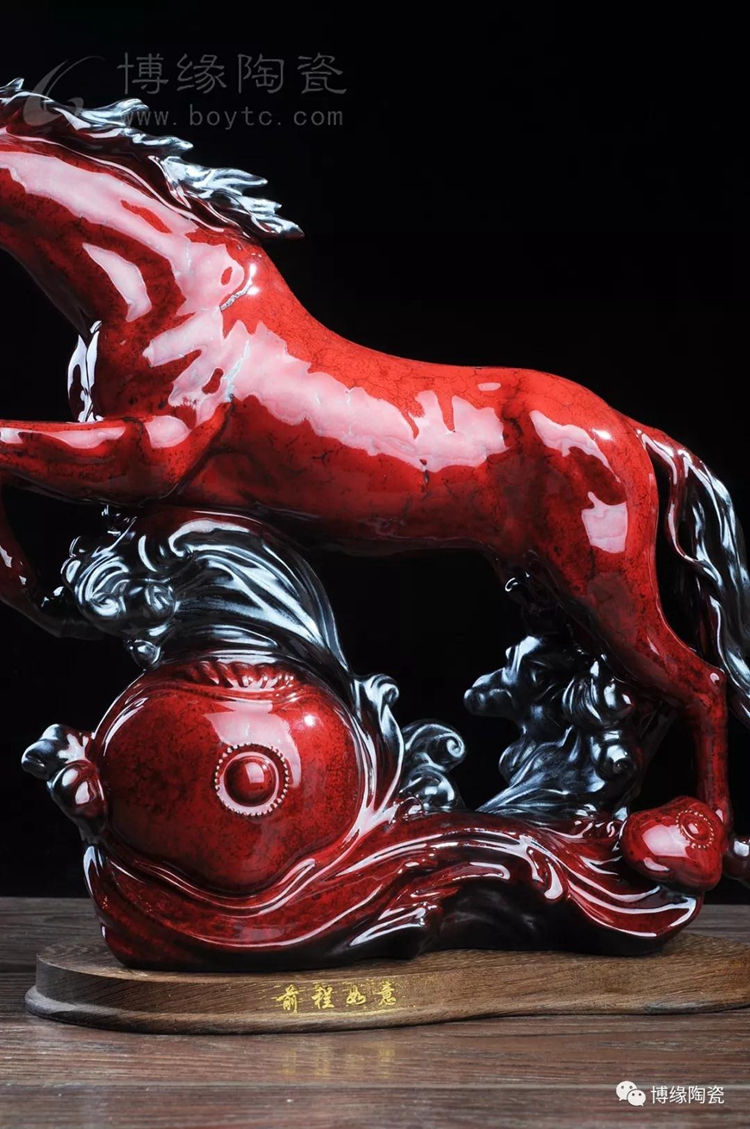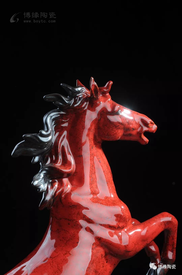 《前程如意》、《唐馬》、《立馬成功》、《馬踏飛燕》、《踏浪天馬》作品采用烈焰紅釉經(jīng)1300多度高溫?zé),產(chǎn)生窯變效果,釉面鮮艷、喜慶。所塑駿馬精神抖擻,身強(qiáng)力壯,有的兩只前蹄騰空躍起,威風(fēng)凜凜,鬃毛隨風(fēng)擺動,極富動感。在皮膚下面, 是熱血奔涌的血管,進(jìn)而是塊狀的肌肉與健壯的骨架,馬的蹄、鬢毛、眼神、耳朵、乃至鼻息,都傳遞出 濃烈的信息,具有很強(qiáng)的藝術(shù)感染力。