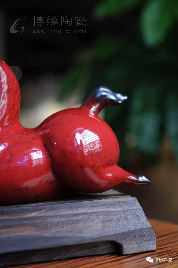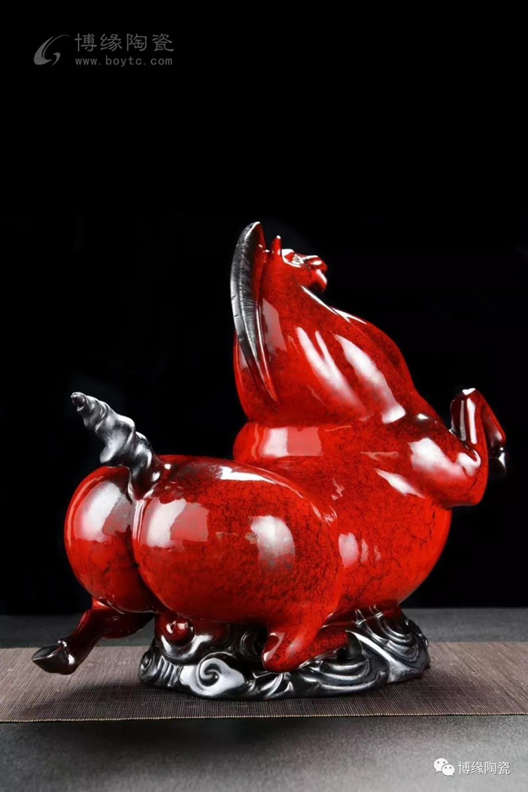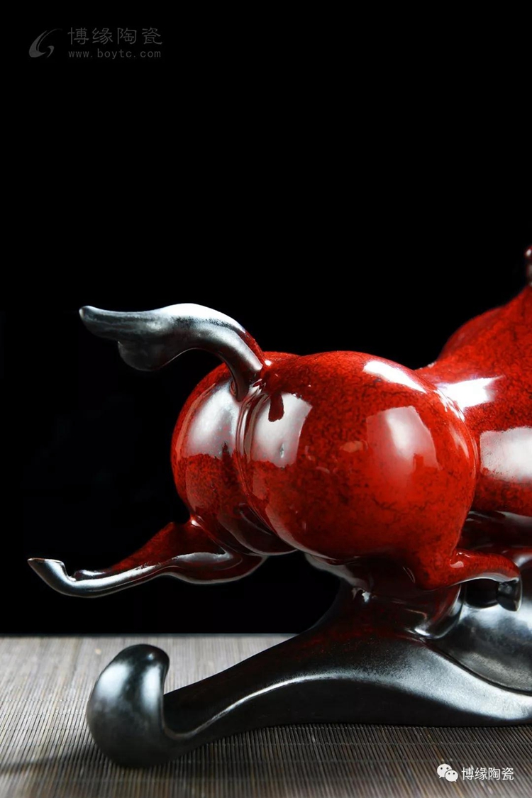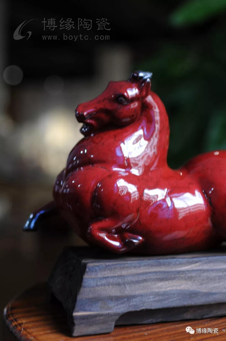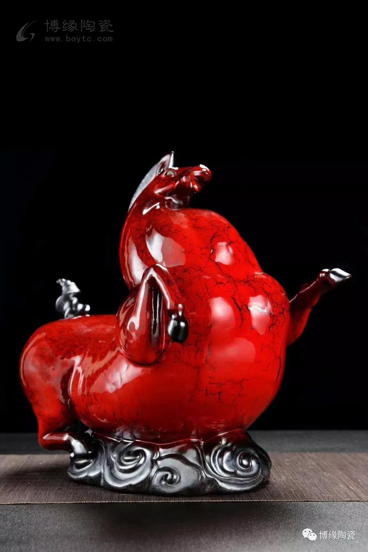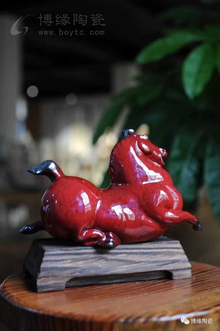 《前程如意》、《唐馬》、《立馬成功》、《馬踏飛燕》、《踏浪天馬》作品采用烈焰紅釉經(jīng)1300多度高溫?zé),產(chǎn)生窯變效果,釉面鮮艷、喜慶。所塑駿馬精神抖擻,身強(qiáng)力壯,有的兩只前蹄騰空躍起,威風(fēng)凜凜,鬃毛隨風(fēng)擺動,極富動感。在皮膚下面, 是熱血奔涌的血管,進(jìn)而是塊狀的肌肉與健壯的骨架,馬的蹄、鬢毛、眼神、耳朵、乃至鼻息,都傳遞出 濃烈的信息,具有很強(qiáng)的藝術(shù)感染力。