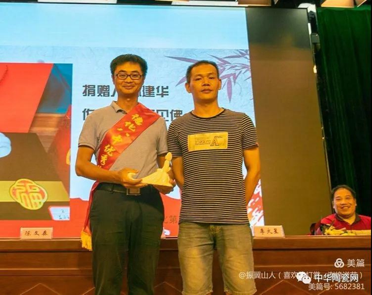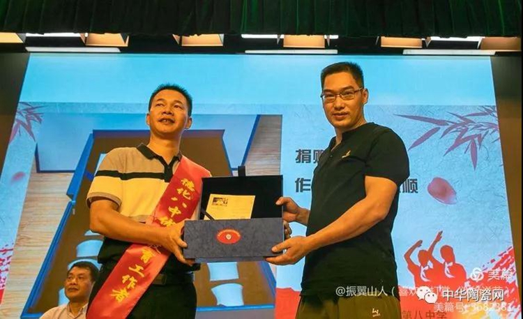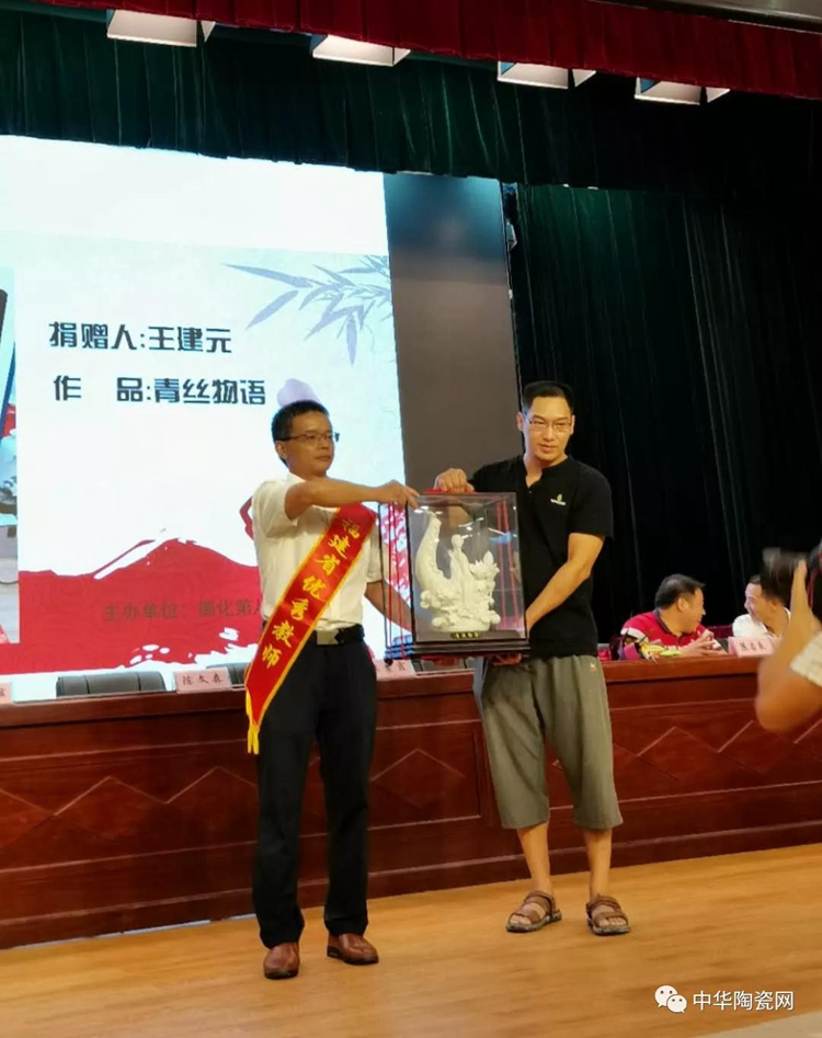 隨著學生為優(yōu)秀教師獻花后,德化縣知名青年陶瓷大師登臺給每位獲獎教師頒發(fā)價值不菲的珍貴瓷雕禮品;陳文森校長也為大師們逐個頒發(fā)《捐贈證書》。