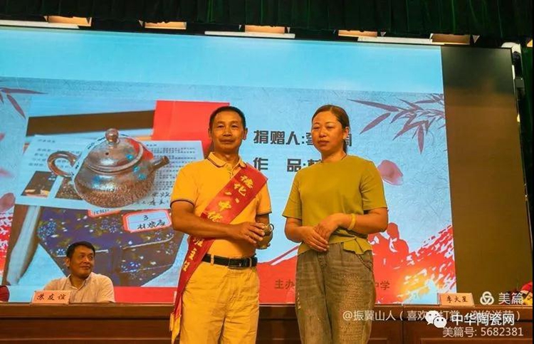 由德化縣教育局楊光照副局長、縣教育工會主席陳麗珍、第三實驗小學方金輝校長、第三實驗小學李華炬副校長為捐贈作品的陶瓷藝術(shù)大師頒發(fā)捐贈證書