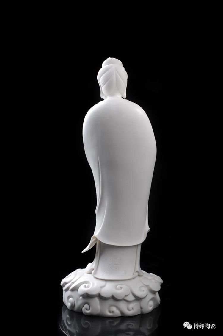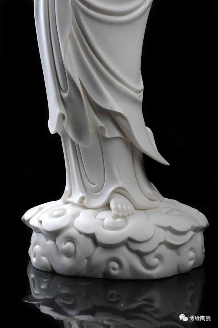 早在明代德化白瓷佛像就名聲在外,一代“瓷圣”何朝宗佛像名作流傳后世,成為世界各大博物館收藏的珍品,更對(duì)佛像雕塑史上產(chǎn)生深遠(yuǎn)的影響,形成“何派”雕塑,其開(kāi)創(chuàng)的捏、塑、雕、刻、刮、削、接、貼八字技法延用至今。何派觀音雕塑注重于細(xì)節(jié)之美,精益求精,故而十分著意衣紋的刻畫(huà),使線條流暢,翻轉(zhuǎn)自然。觀其佛像,仿佛有春風(fēng)拂面,衣袂飄揚(yáng)的出塵之感。