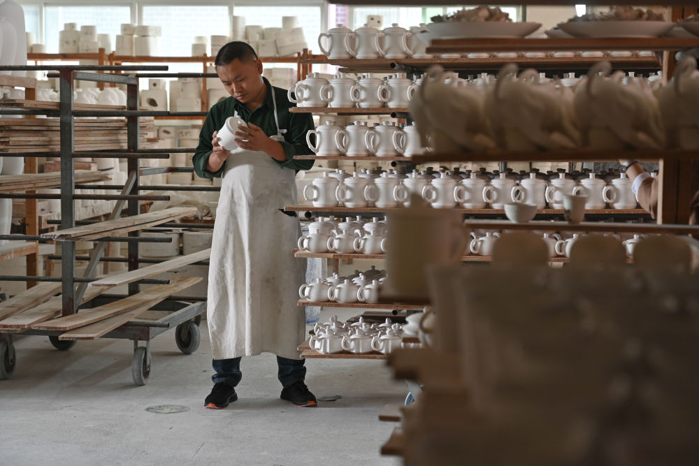 10月21日,在福建省泉州市德化縣順美陶瓷廠,工人擺放馬克杯以便烘干。