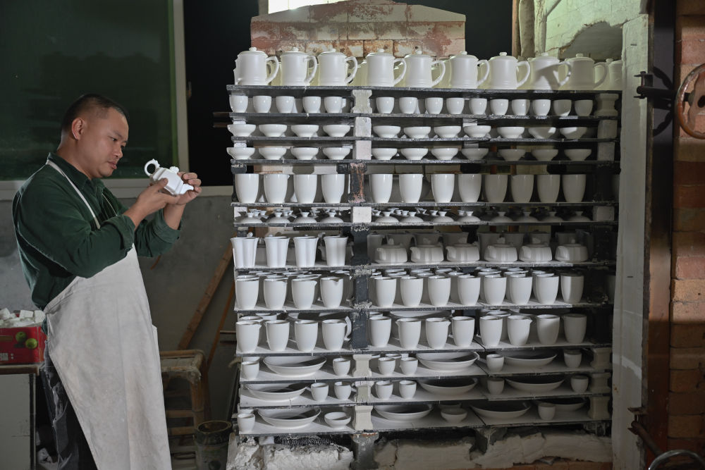10月20日,徐金寶查看剛剛出窯的白瓷餐具。