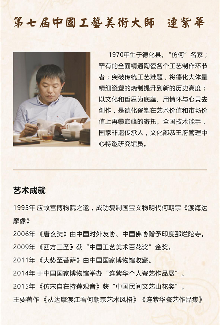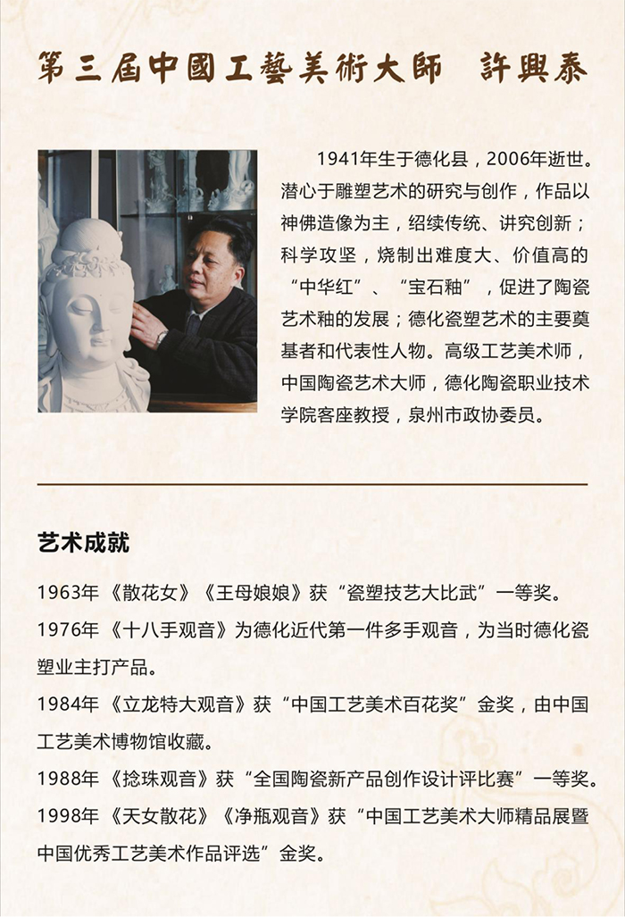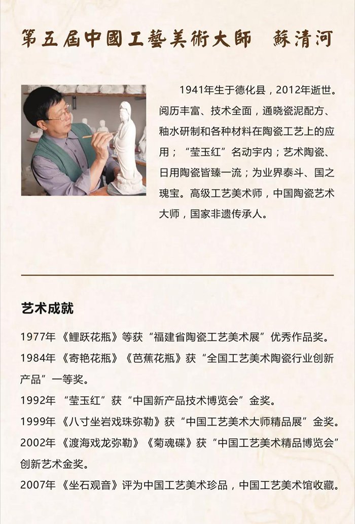 2020年,《八閩中國工藝美術大師全集》在原《八閩瑰寶——八閩中國工藝美術大師合集》基礎上,潤色補充,收錄福建省全部49位國大師資料,其中德化獲評中國工藝美術大師有6人,他們憑借著對工藝陶瓷精益求精的追求與堅守,成為引領一方的代表性人物。