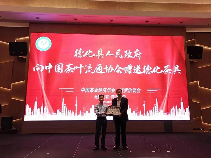 在本屆中國(guó)茶業(yè)經(jīng)濟(jì)年會(huì)投資貿(mào)易洽談會(huì)上,德化縣精心制作了德化茶具產(chǎn)業(yè)推介片——《千帆競(jìng)發(fā)的德化陶瓷茶具》在洽談會(huì)中進(jìn)行播放推介,縣政府副處級(jí)干部徐文福向中國(guó)茶葉流通協(xié)會(huì)贈(zèng)送德化高檔茶具,中國(guó)茶葉流通協(xié)會(huì)會(huì)長(zhǎng)、全國(guó)茶葉標(biāo)準(zhǔn)化技術(shù)委員會(huì)主任委員王慶親手接收贈(zèng)品。