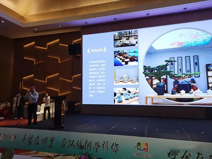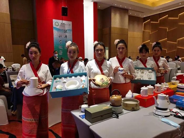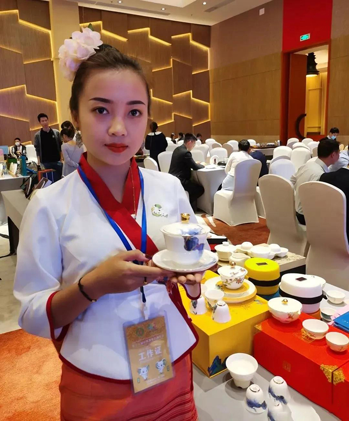 中國(guó)茶具城企劃部負(fù)責(zé)人顏寶敬在會(huì)上做“好茶配好器”主題演講,向與會(huì)嘉賓隆重介紹德化縣的茶具產(chǎn)業(yè)現(xiàn)狀、規(guī)模、亮點(diǎn)、特色等,大力推介德化陶瓷茶具與茶葉的相互配合,相得益彰,重點(diǎn)推介德化高檔茶具的“三度標(biāo)準(zhǔn)”和作為送禮的“三品價(jià)值”,在演講的同時(shí),6位年輕漂亮的傣族禮儀小姐手捧德化白瓷茶具、羊脂玉個(gè)人杯、茶葉罐、燒水壺、煮茶壺,向與會(huì)嘉賓進(jìn)行展示,讓在場(chǎng)的嘉賓認(rèn)識(shí)到德化陶瓷的精美,對(duì)德化瓷稱(chēng)贊不已!