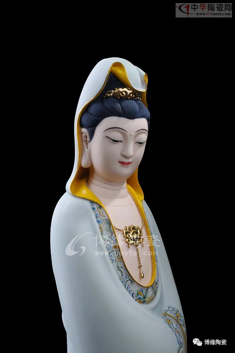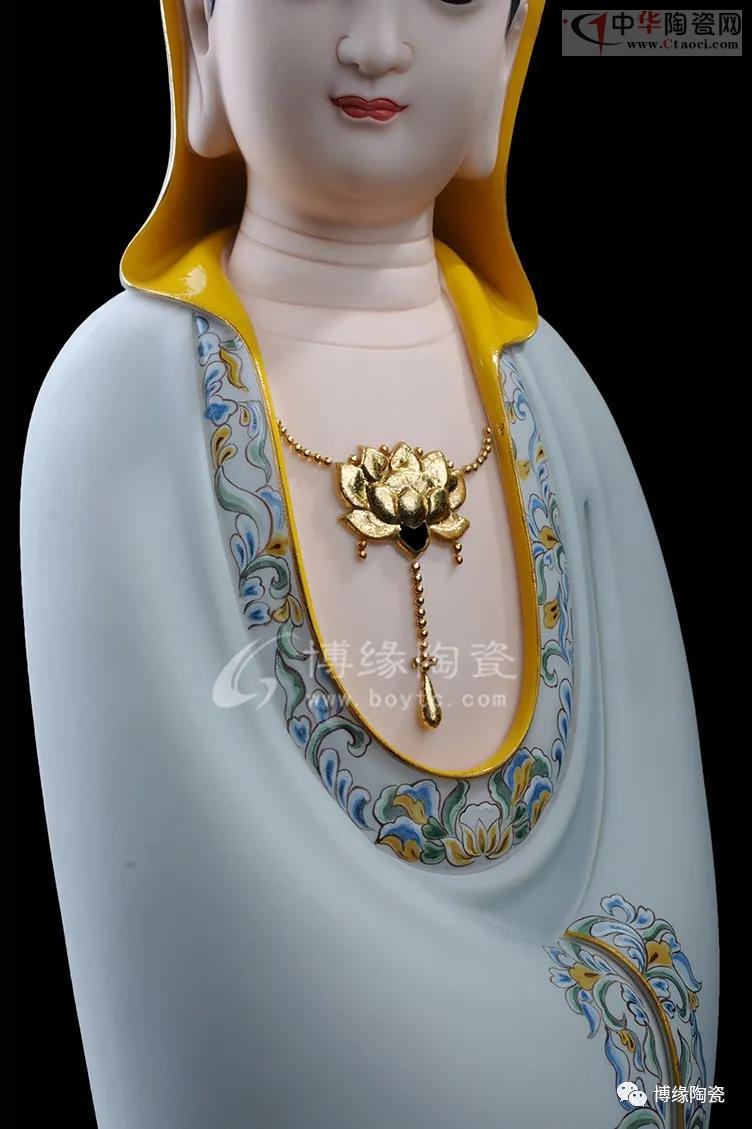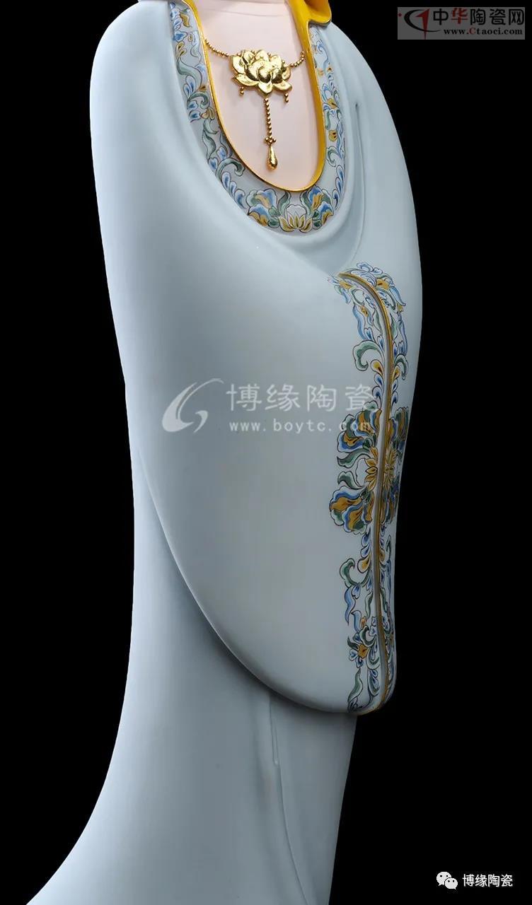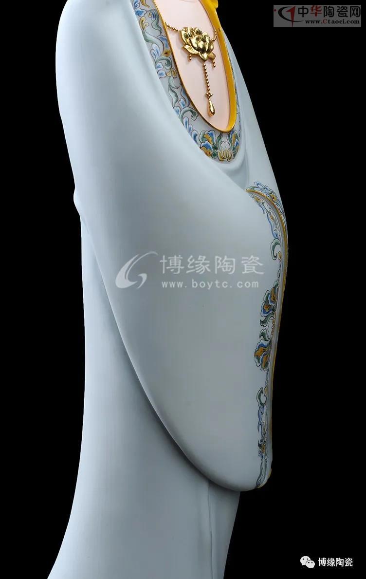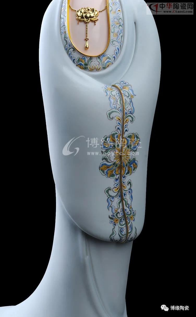 《瓷韻觀音》作品繼承德化“何派”傳統(tǒng)風(fēng)格加以創(chuàng)新,線條簡潔,類顯S型,作品造型優(yōu)美,觀音面部低首垂目、飽滿豐潤、神情慈祥,似在俯瞰塵世眾生。人物的珠串、花飾手工捏塑而成,細(xì)致逼真,作品以德化白瓷為胎體經(jīng)手工繪制,珠串、頭飾手工繪金,使作品更高貴。