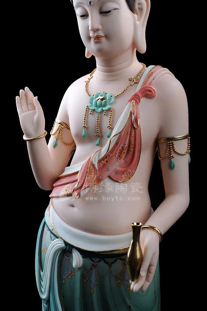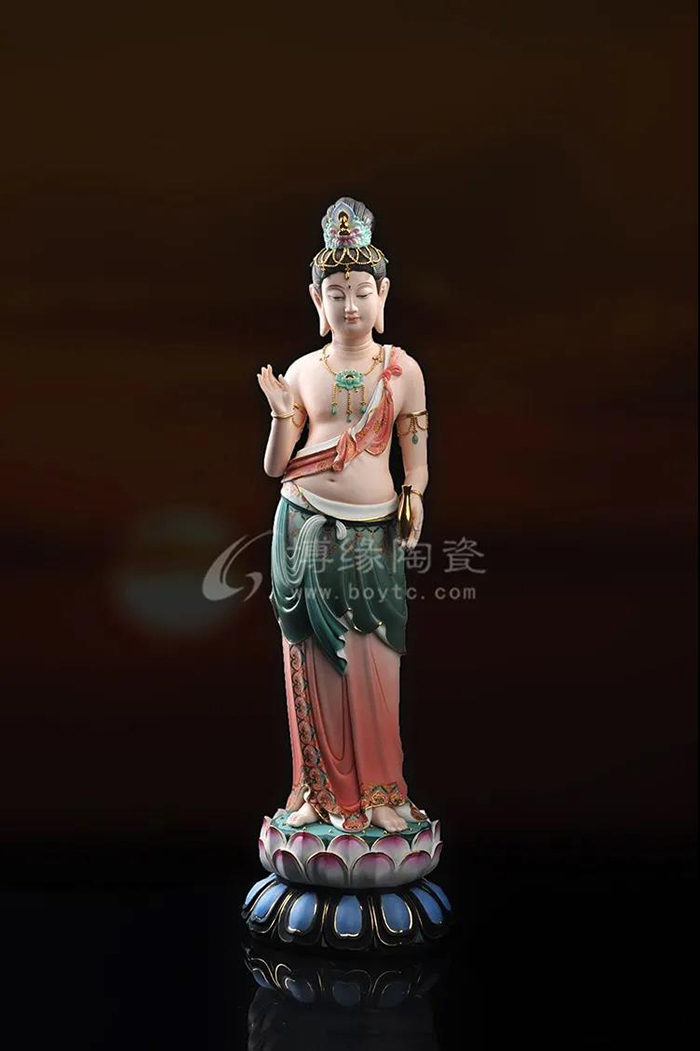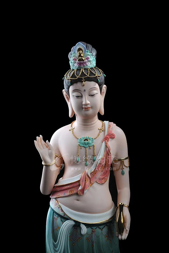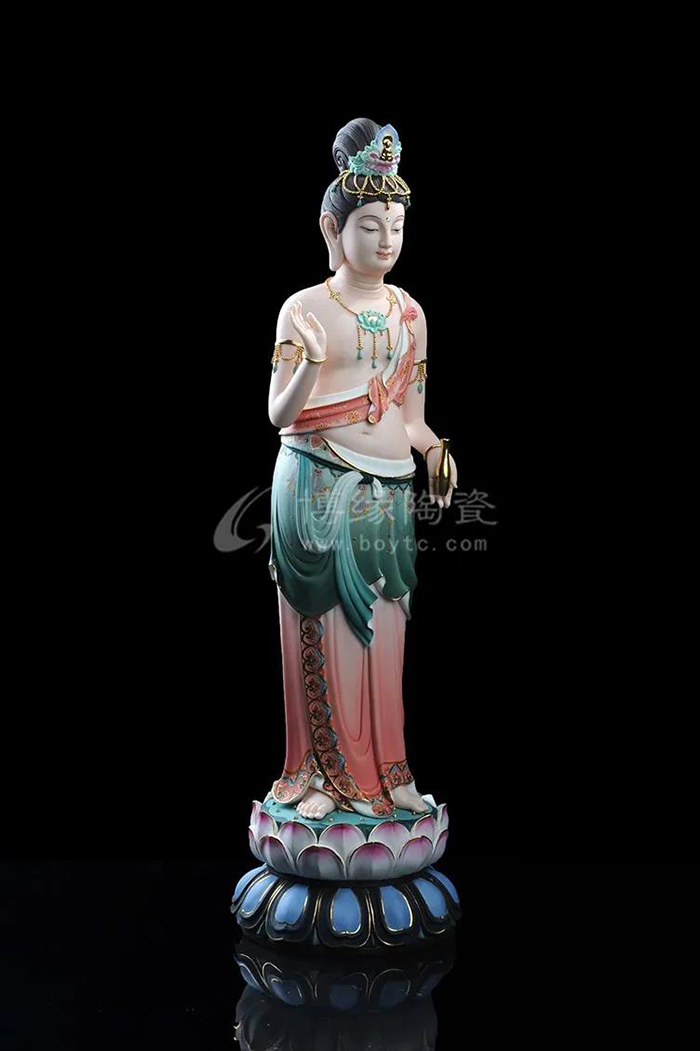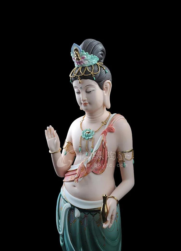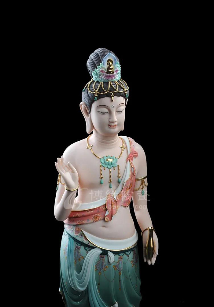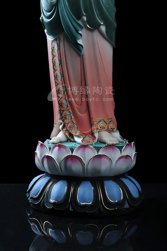 觀音立于蓮花之上,衣紋線條流暢飄逸,雙目微閉,神情安詳,形象傳神。作品精雕巧塑,作品以白瓷為胎骨,手工描金、繪彩,使作品更具層次感,更深動。