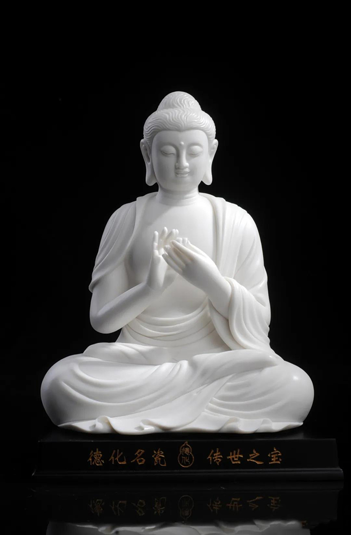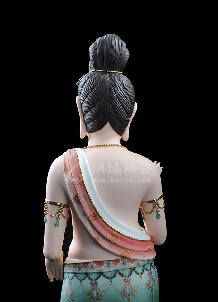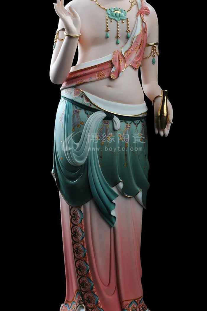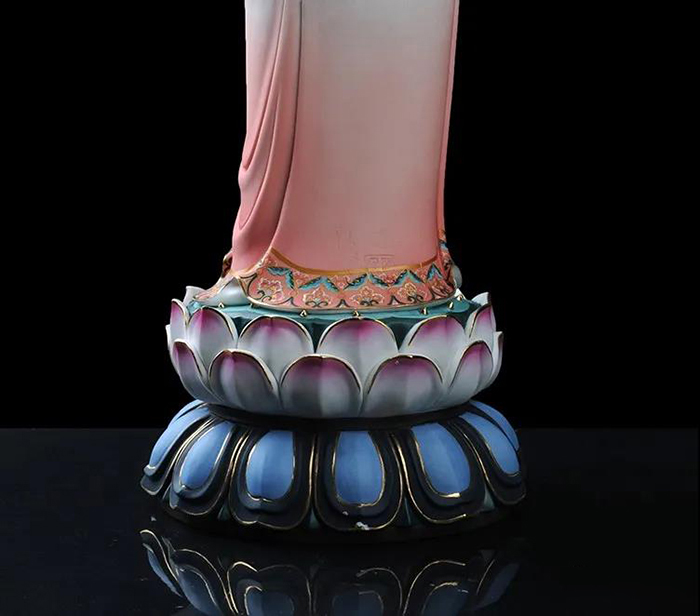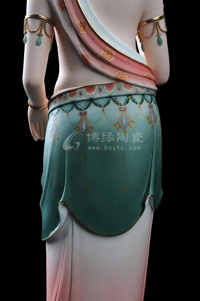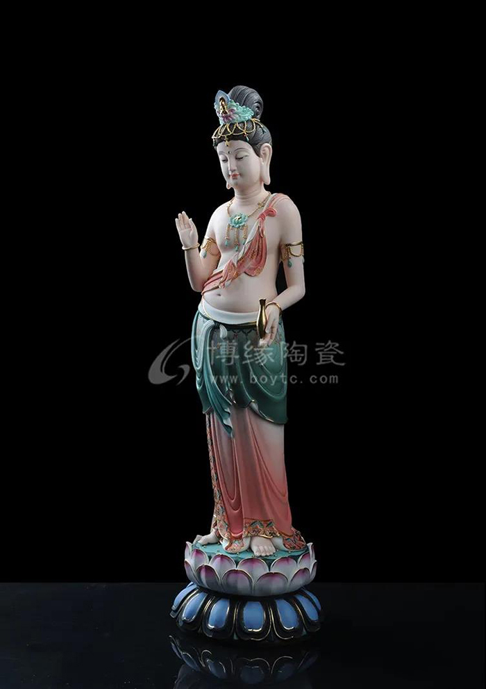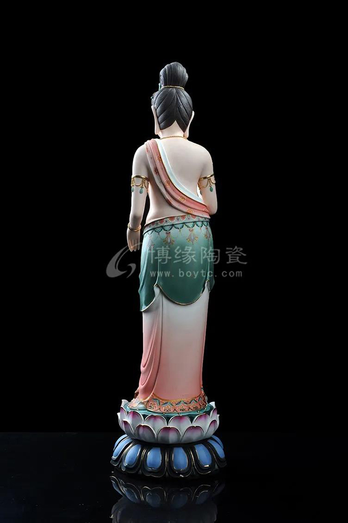 觀音立于蓮花之上,衣紋線條流暢飄逸,雙目微閉,神情安詳,形象傳神。作品精雕巧塑,作品以白瓷為胎骨,手工描金、繪彩,使作品更具層次感,更深動。