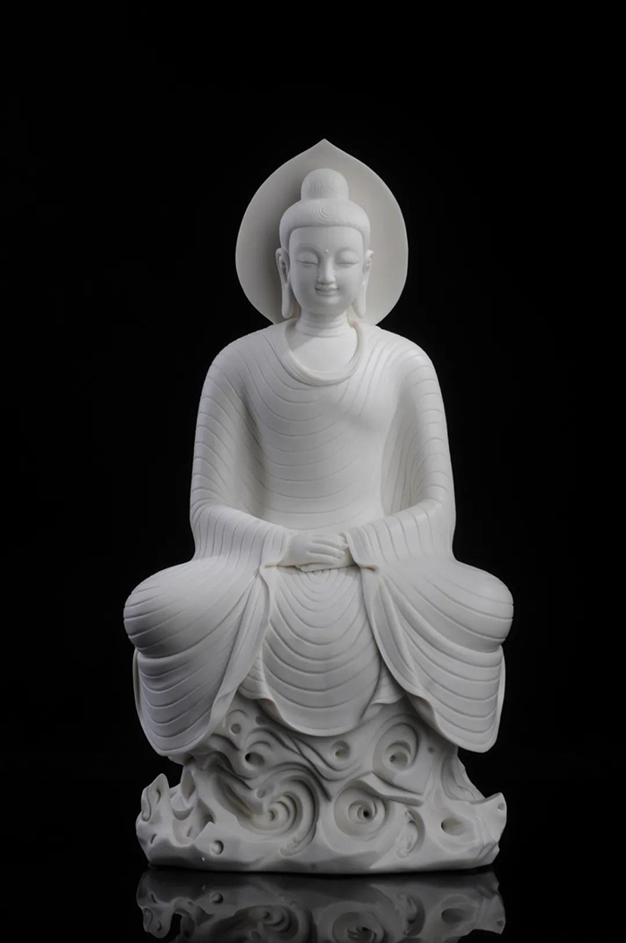 觀音文紋線條清晰、簡潔、瀟灑,多變化,柔媚流暢,翻轉自然,手托凈水瓶,神情嫻雅平靜,安詳自若,雙目低垂凝思。整座塑像精巧細致,神態(tài)如生。