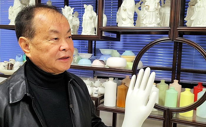 疫情讓福建省玉瓷發(fā)展股份有限公司董事長溫克仁找到了新商機。在他的辦公室里,記者看到桌上和地上擺放著好幾個陶瓷手模。