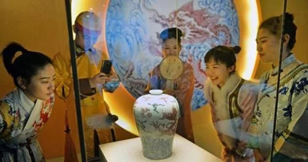 12月28日,身著古裝的工作人員在觀看瓷器特展。當(dāng)天,“龍翔九天——元明清御用瓷器特展”在長沙博物館開幕,本次特展共遴選元明清御用瓷器128件(套)。展覽免費開放至2021年3月28日。 湖南日報記者 李健 攝