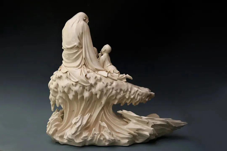 而且在牛的中間部位,他又結(jié)合了德化傳統(tǒng)的線條表現(xiàn)方法,做成了一個上升的線條,與孩童形成一個三角形的結(jié)構(gòu),使得作品上半部分精致細膩,而下半部分的牛則采用了虛化的手法,勾勒出一頭牛的輪廓,但又不完全是,形成了“上實下虛”的表現(xiàn)手法。