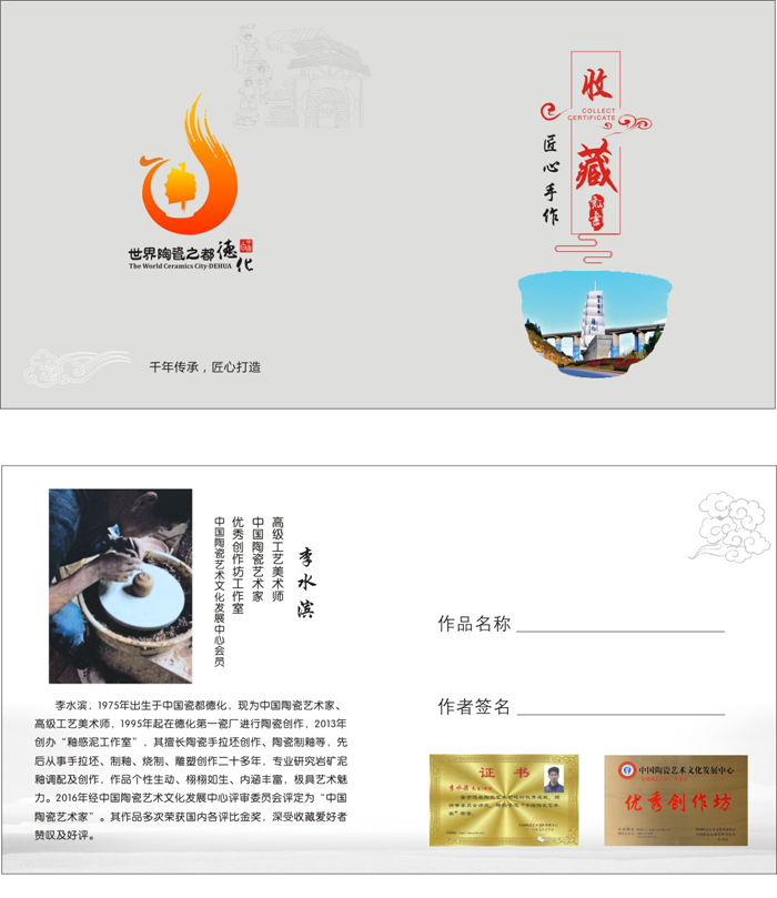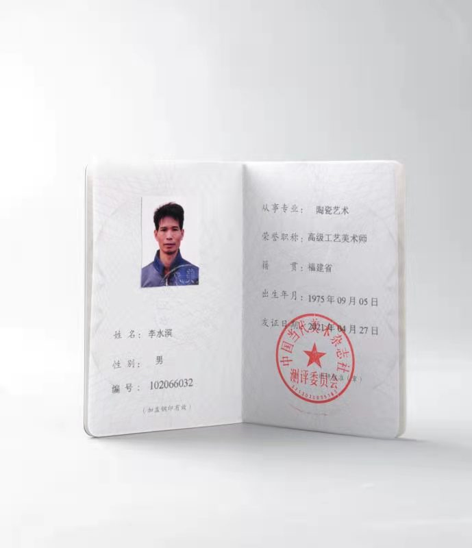 李水濱,1975年出生于中國瓷都德化,現(xiàn)為中國陶瓷藝術(shù)家、高級(jí)工藝美術(shù)師、優(yōu)秀陶瓷創(chuàng)作坊工作室、優(yōu)秀陶瓷藝術(shù)家,1995年起在德化第一瓷廠進(jìn)行陶瓷創(chuàng)作,2013年創(chuàng)辦“釉感泥工作室”,其擅長(zhǎng)陶瓷手拉坯創(chuàng)作、陶瓷制釉等,先后從事手拉坯、制釉、燒制、雕塑創(chuàng)作二十多年,專業(yè)研究巖礦泥釉調(diào)配及創(chuàng)作,作品個(gè)性生動(dòng)、栩栩如生、內(nèi)涵豐富,極具藝術(shù)魅力。2016年經(jīng)中國陶瓷藝術(shù)文化發(fā)展中心評(píng)審委員會(huì)評(píng)定為“中國陶瓷藝術(shù)家”。其作品多次榮獲國內(nèi)各評(píng)比金獎(jiǎng),深受收藏愛好者贊嘆及好評(píng)。