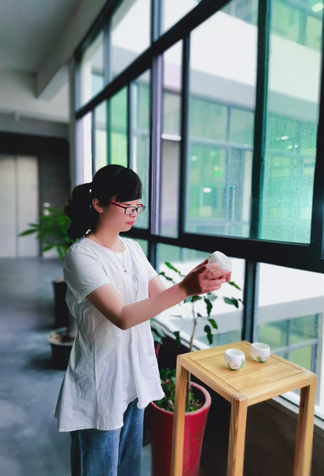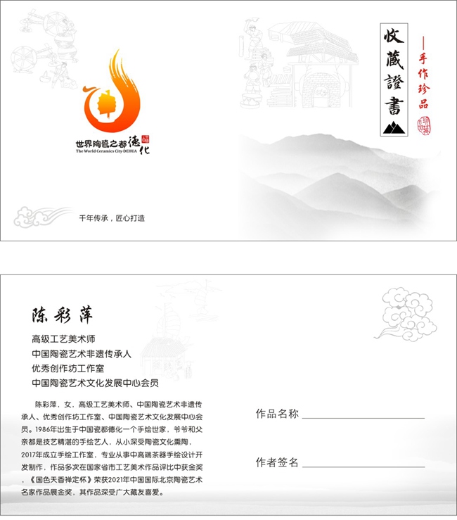 陳彩萍,女,高級工藝美術(shù)師、中國陶瓷藝術(shù)非遺傳承人、優(yōu)秀創(chuàng)作坊工作室、中國陶瓷藝術(shù)文化發(fā)展中心會員。1986年出生于中國瓷都德化一個手繪世家, 爺爺和父親都是技藝精湛的手繪藝人,從小深受陶瓷文化熏陶,2017年成立手繪工作室,專業(yè)從事中高端茶器手繪設(shè)計開發(fā)制作,作品多次在國家省市工藝美術(shù)作品評比中獲金獎《國色天香禪定杯》榮獲2021年中國國際北京陶瓷藝術(shù)名家作品展金獎,其作品深受廣大藏友喜愛。