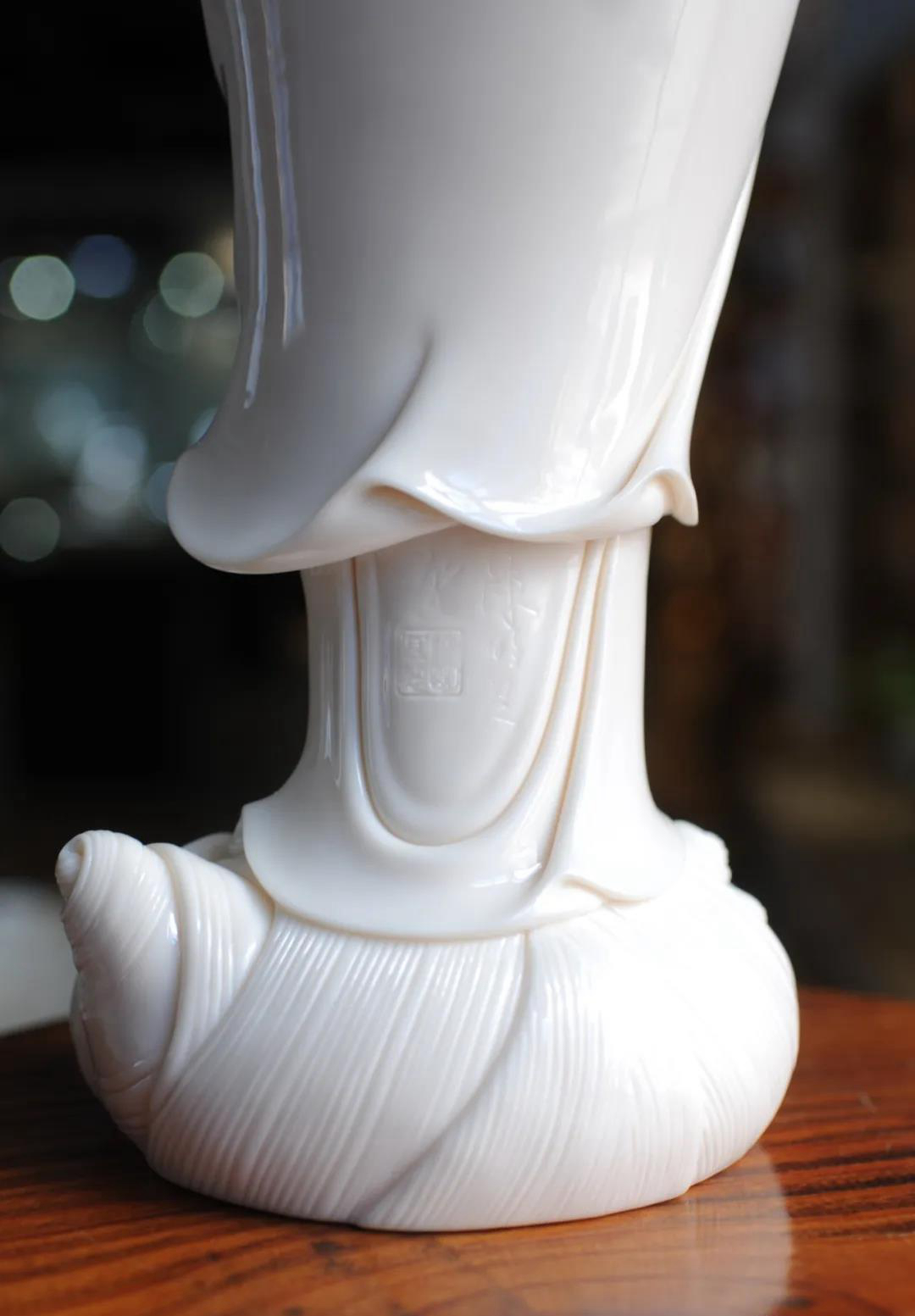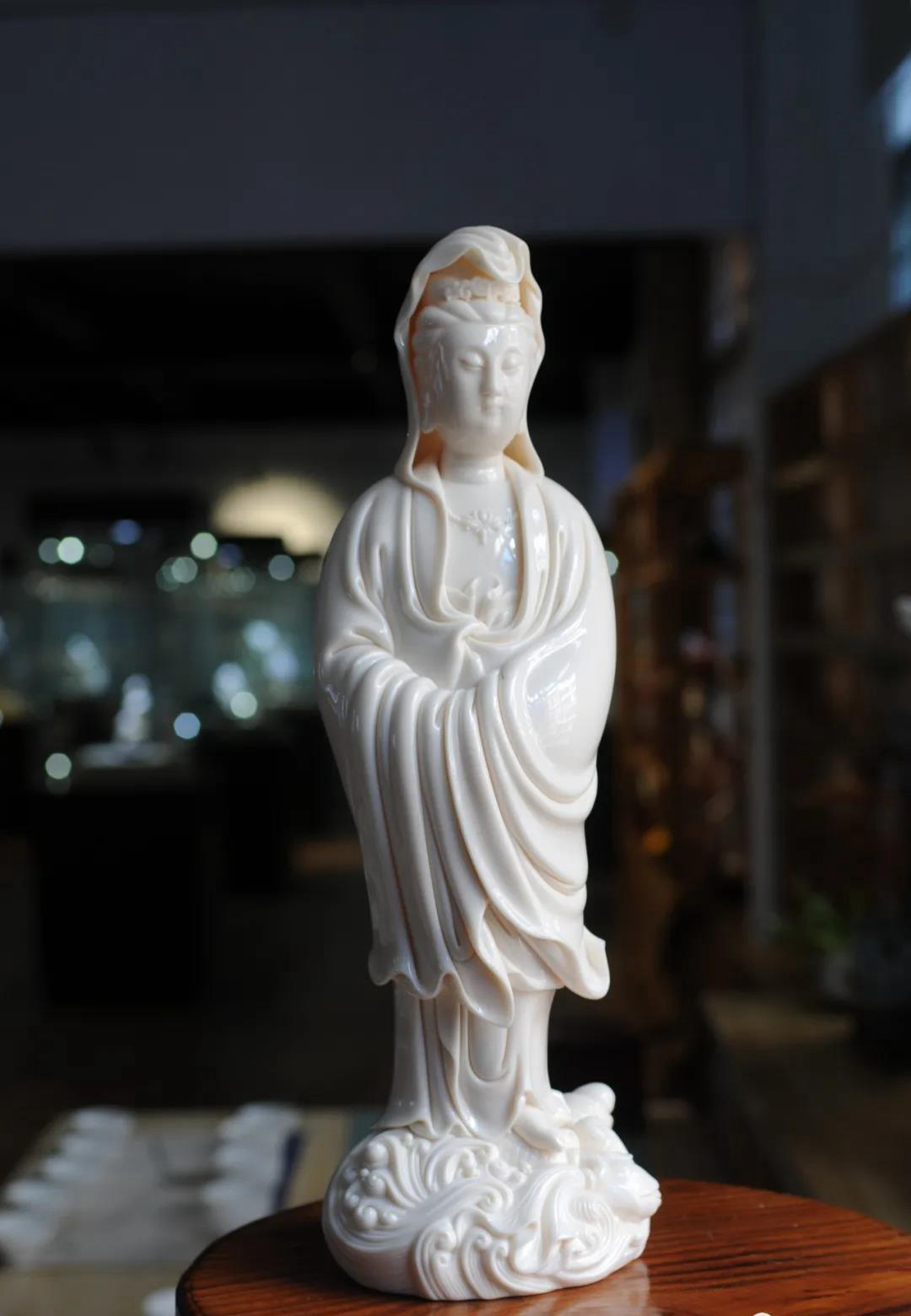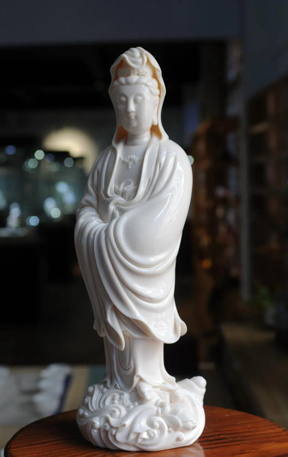 德化瓷器,以白瓷為最;白瓷之中,又以佛像為最。德化白瓷所塑佛像有性格鮮明、造型優(yōu)美、神態(tài)逼真、風(fēng)格洗練的特點(diǎn)。有一種單純的雕塑美和原材料的質(zhì)地美,最能體現(xiàn)佛教樸素、平和的思想。 早在明代德化白瓷佛像就名聲在外,一代“瓷圣”何朝宗佛像名作流傳后世,成為世界各大博物館收藏的珍品,更對佛像雕塑史上產(chǎn)生深遠(yuǎn)的影響,形成“何派”雕塑,其開創(chuàng)的捏、塑、雕、刻、刮、削、接、貼八字技法延用至今。何派觀音雕塑注重于細(xì)節(jié)之美,精益求精,故而十分著意衣紋的刻畫,使線條流暢,翻轉(zhuǎn)自然。觀其佛像,仿佛有春風(fēng)拂面,衣袂飄揚(yáng)的出塵之感。