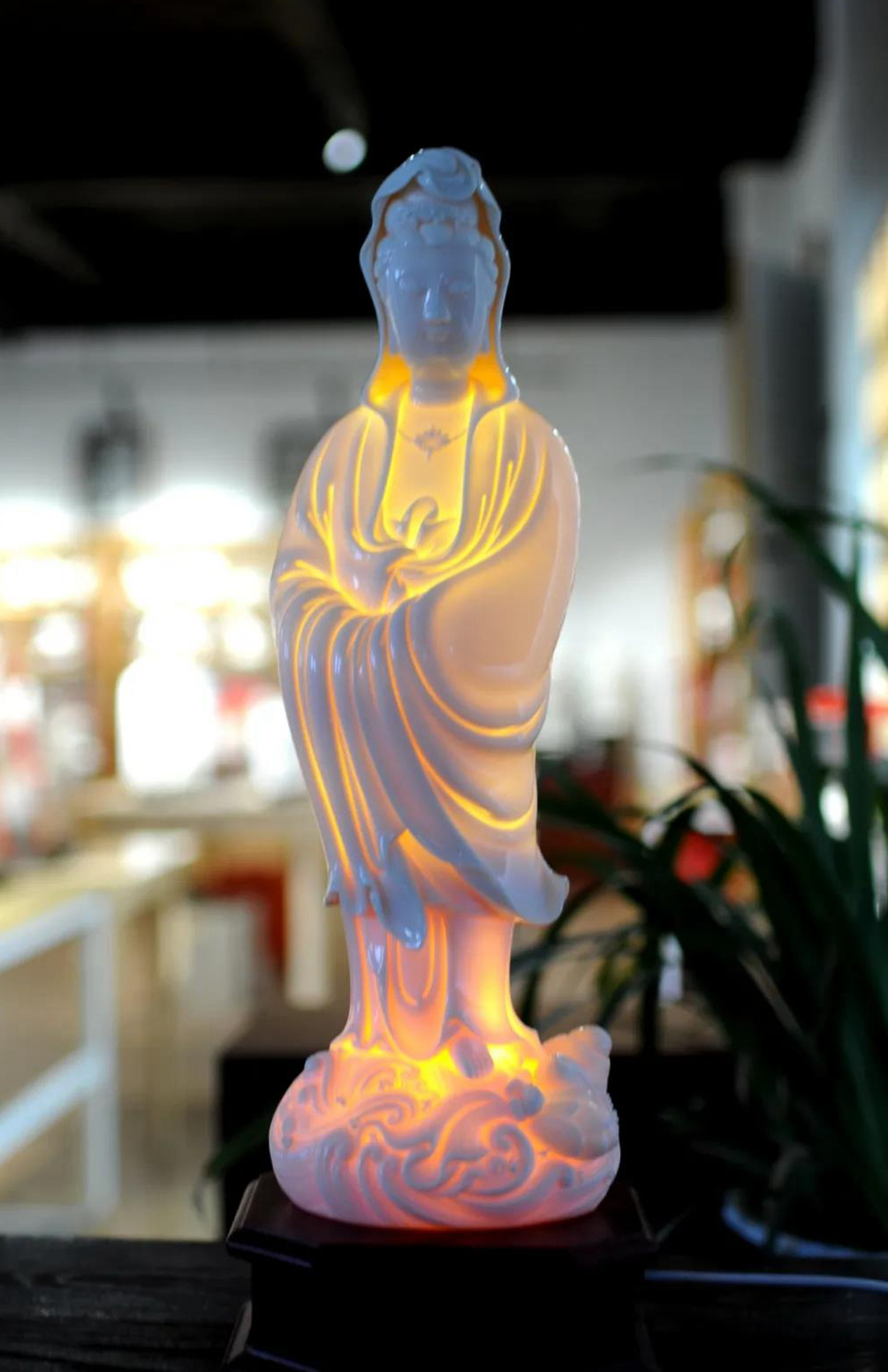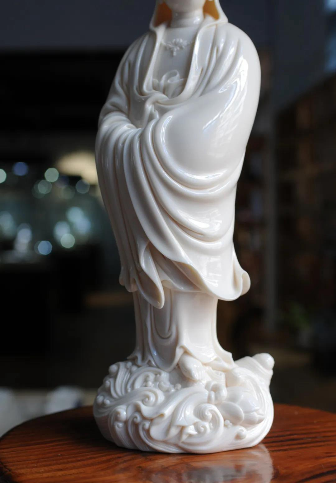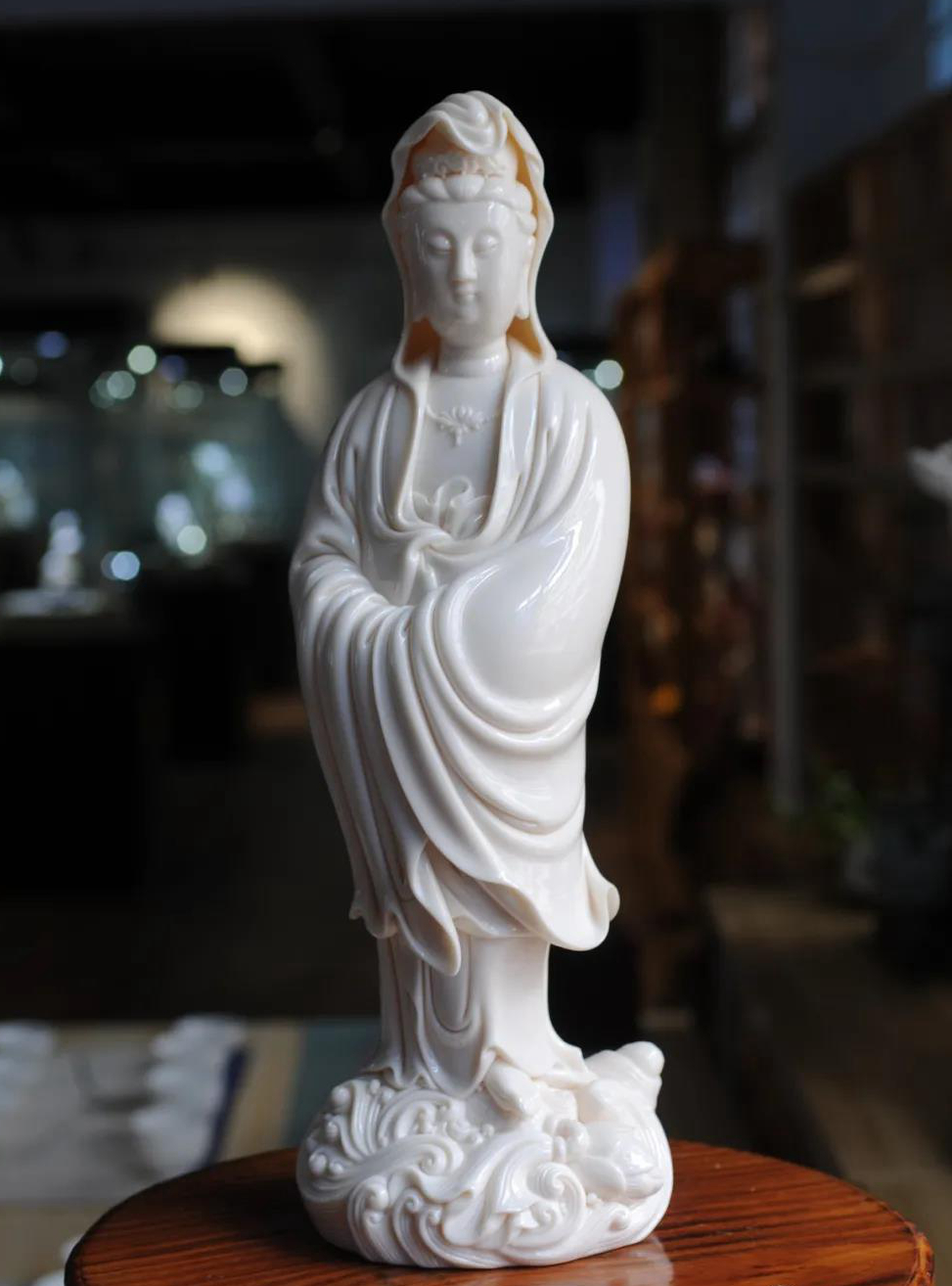德化瓷器,以白瓷為最;白瓷之中,又以佛像為最。德化白瓷所塑佛像有性格鮮明、造型優(yōu)美、神態(tài)逼真、風(fēng)格洗練的特點(diǎn)。有一種單純的雕塑美和原材料的質(zhì)地美,最能體現(xiàn)佛教樸素、平和的思想。 早在明代德化白瓷佛像就名聲在外,一代“瓷圣”何朝宗佛像名作流傳后世,成為世界各大博物館收藏的珍品,更對佛像雕塑史上產(chǎn)生深遠(yuǎn)的影響,形成“何派”雕塑,其開創(chuàng)的捏、塑、雕、刻、刮、削、接、貼八字技法延用至今。何派觀音雕塑注重于細(xì)節(jié)之美,精益求精,故而十分著意衣紋的刻畫,使線條流暢,翻轉(zhuǎn)自然。觀其佛像,仿佛有春風(fēng)拂面,衣袂飄揚(yáng)的出塵之感。