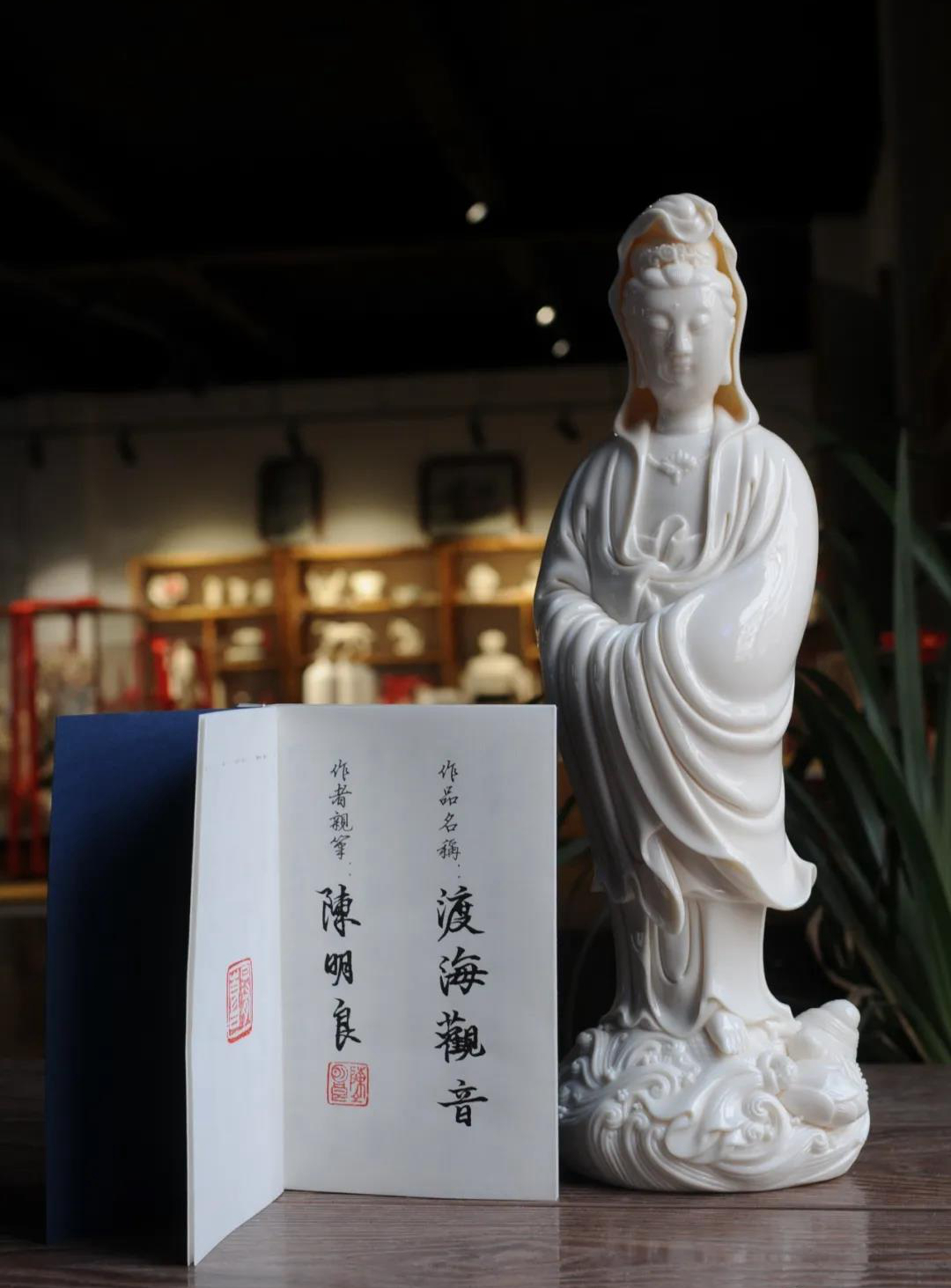《渡海觀音》由中國工藝美術(shù)大師陳明良創(chuàng)作,作品長13.5cm,寬 12.5cm, 高40 cm,采用德化優(yōu)質(zhì)高嶺土,經(jīng)1300多度高溫?zé)疲商貪櫵朴裢腹饩強(qiáng)。觀音立于海浪之上,衣著隨風(fēng)揚(yáng)起,具有乘浪而行的動感藝術(shù)效果。作品傳承明代何派技法,精雕細(xì)刻,線條流暢,衣紋自然、飄逸,溫潤如玉,更展現(xiàn)其純凈、高雅的“東方女神”之魅力。作者以熟練的雕塑技巧和豐富的生活體驗(yàn),賦予觀音以鮮活的生命,使之更加生活化,具有超凡脫俗之軒昂器宇,至今仍洋溢著感人的藝術(shù)魅力。整件瓷雕胎白,堅(jiān)實(shí)厚重,質(zhì)感瑩潤。作品手刻簽名,具有很高的收藏及鑒賞價值。
