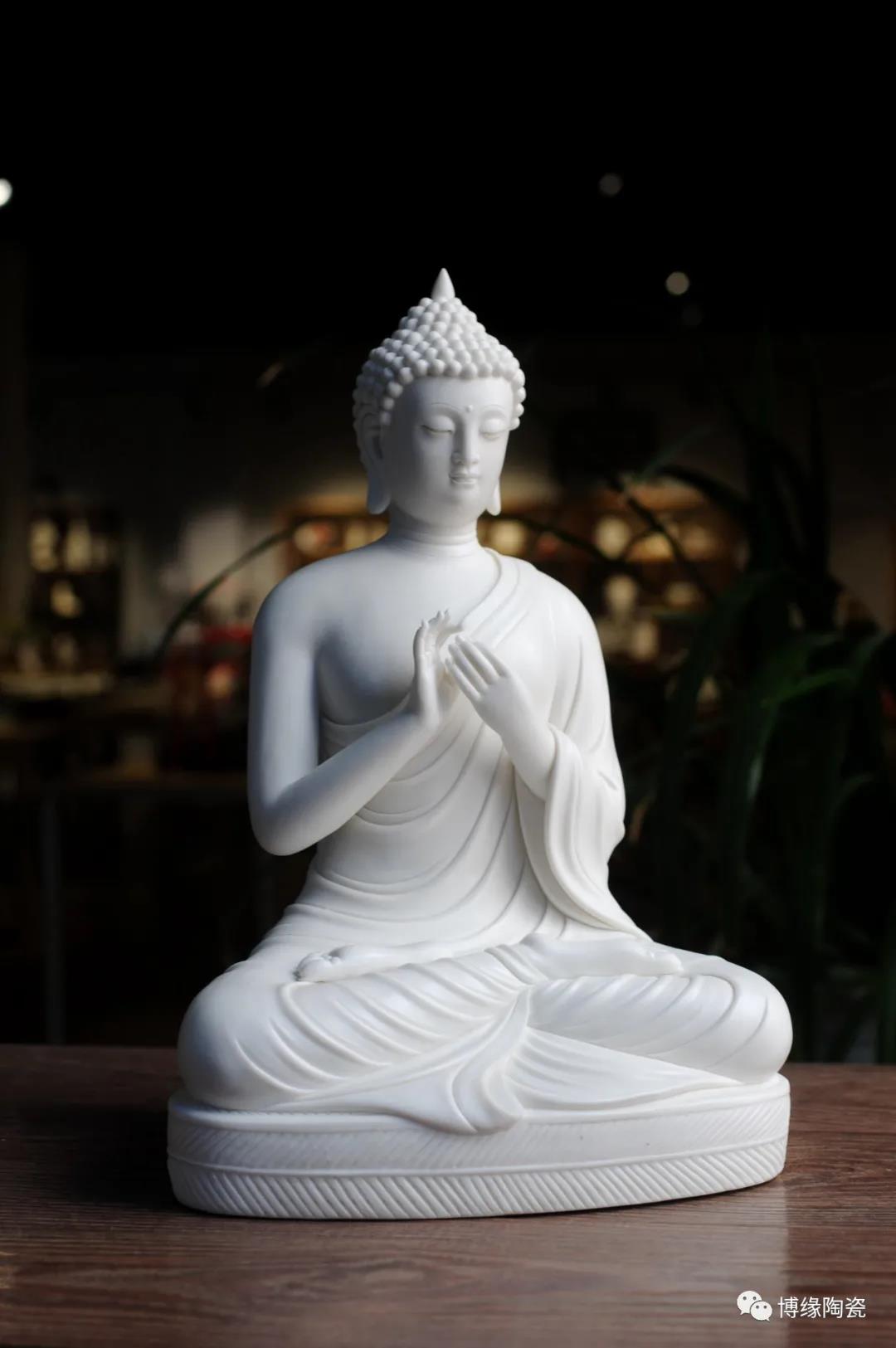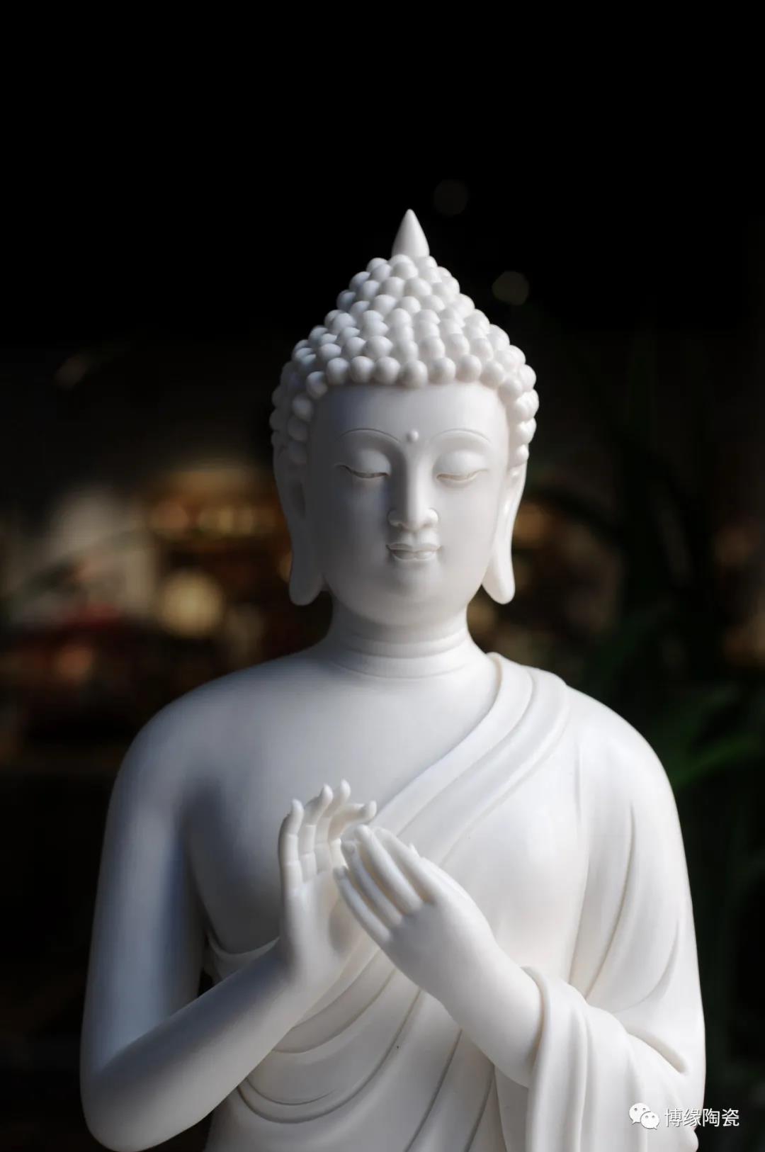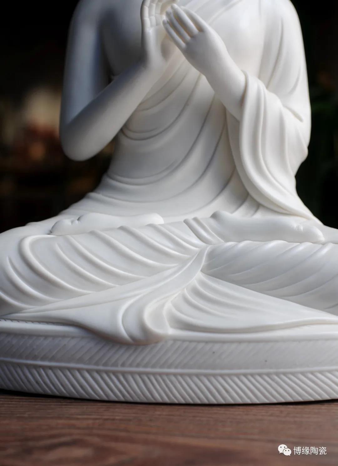 德化瓷器,以白瓷為最;白瓷之中,又以佛像為最。德化白瓷所塑佛像有性格鮮明、造型優(yōu)美、神態(tài)逼真、風(fēng)格洗練的特點。有一種單純的雕塑美和原材料的質(zhì)地美,最能體現(xiàn)佛教樸素、平和的思想。 早在明代德化白瓷佛像就名聲在外,一代“瓷圣”何朝宗佛像名作流傳后世,成為世界各大博物館收藏的珍品,更對佛像雕塑史上產(chǎn)生深遠(yuǎn)的影響,形成“何派”雕塑,其開創(chuàng)的捏、塑、雕、刻、刮、削、接、貼八字技法延用至今。何派佛像雕塑注重于細(xì)節(jié)之美,精益求精,故而十分著意衣紋的刻畫,使線條流暢,翻轉(zhuǎn)自然。觀其佛像,仿佛有春風(fēng)拂面,衣袂飄揚的出塵之感。
