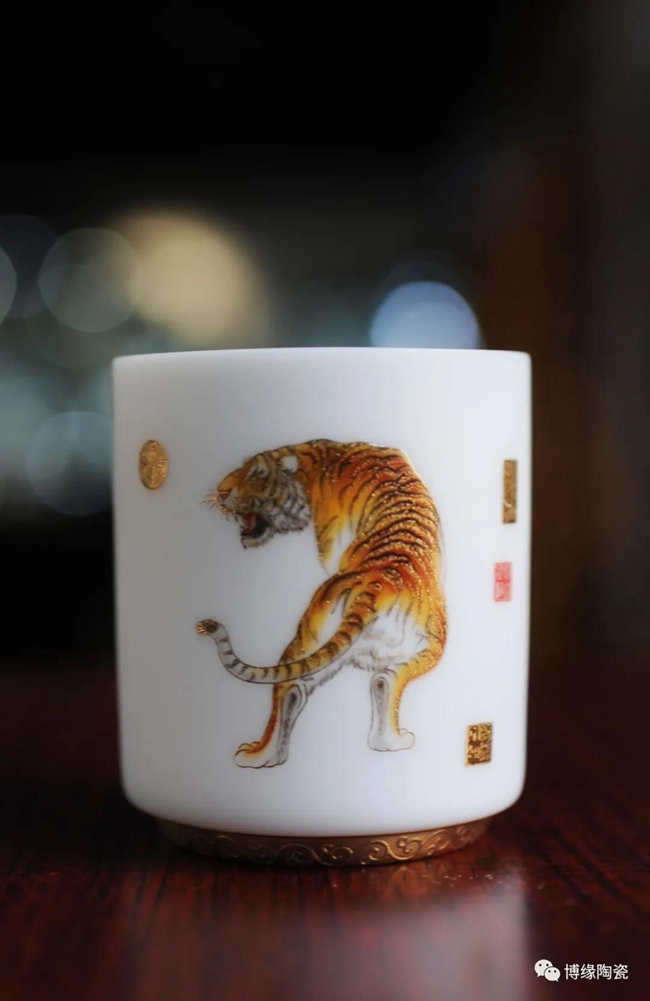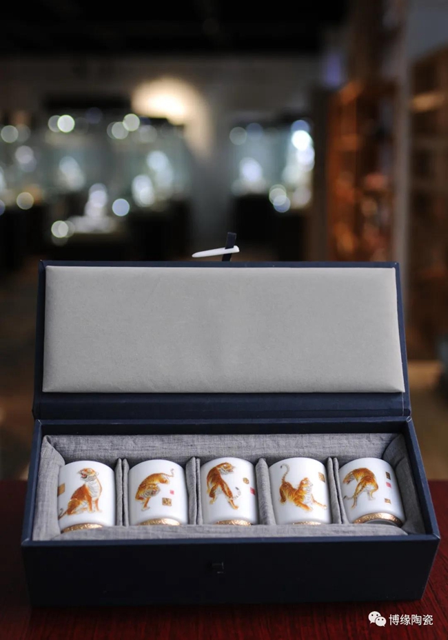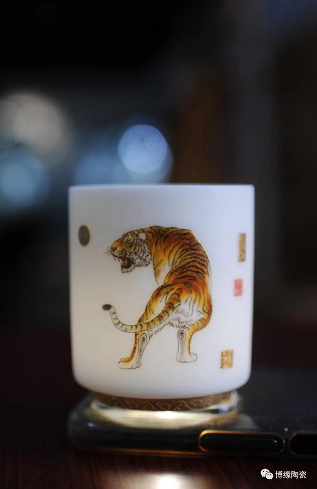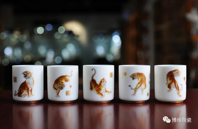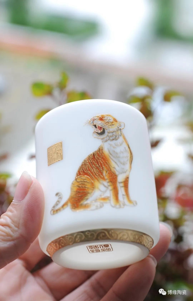 在2022年虎年來臨之際,博緣陶瓷特推出“五福(虎)臨門”羊脂玉瓷杯,五福:第一福"長壽"、第二福"富貴"、第三福"康寧"、第四福"好德"、第五福"善終"。也有人簡稱為壽富康德善。每款杯子采用不同造型的虎圖案,栩栩如生,靈活靈現(xiàn),采用高清堆料花紙工藝,手工描金,使作品更具尊貴,作品采用30000多元/每噸瓷泥1300多度高溫燒制,瓷胎薄潤如玉,具有較高的鑒賞價值。