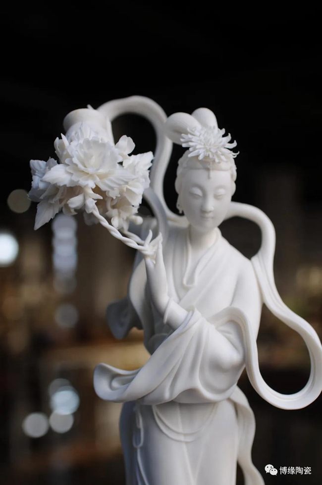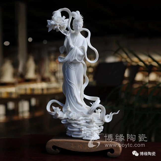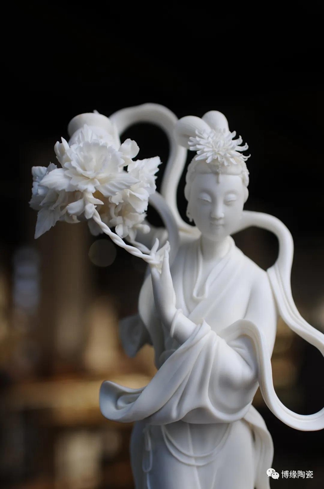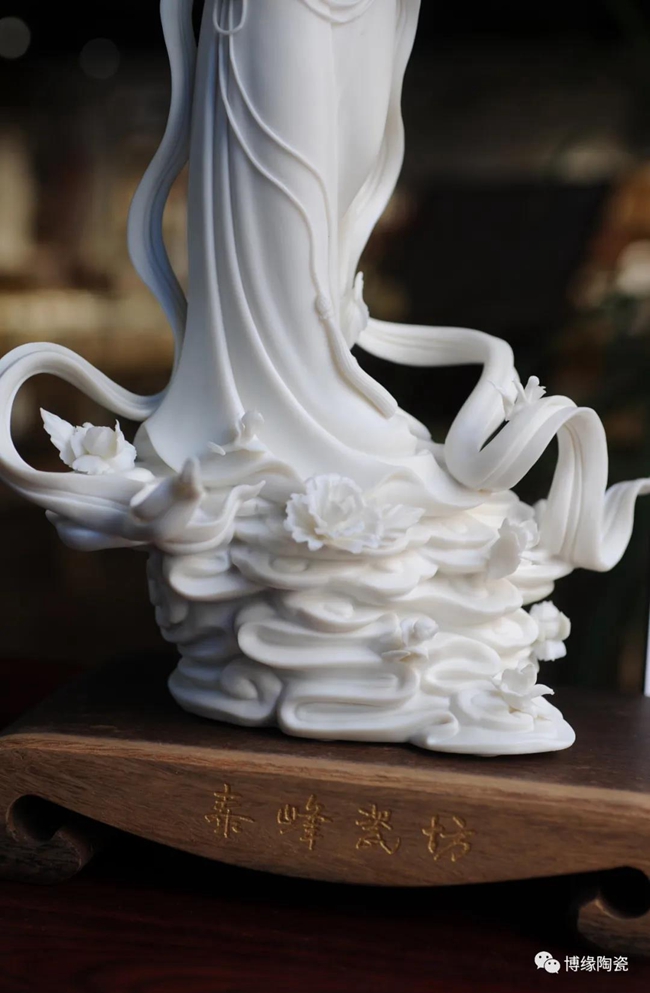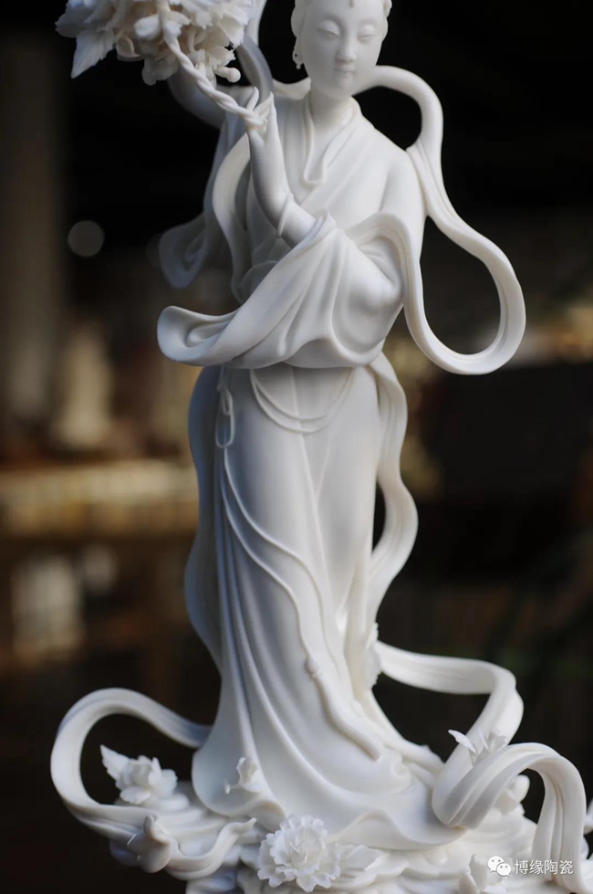 德化是“中國白的故鄉(xiāng)”,在世界瓷壇獨樹一幟,被稱為“世界白瓷之母”,德化白瓷溫潤、明凈、典雅、精巧,被稱“象牙白”、“鵝絨白”,素有“世界白瓷看中國,中國白瓷看德化”之稱。早在明代德化白瓷就名聲在外,一代“瓷圣”何朝宗名作流傳后世,成為世界各大博物館收藏的珍品,更對雕塑史上產(chǎn)生深遠(yuǎn)的影響,形成“何派”雕塑,其開創(chuàng)的捏、塑、雕、刻、刮、削、接、貼八字技法延用至今。何派雕塑注重于細(xì)節(jié)之美,精益求精,故而十分著意衣紋的刻畫,使線條流暢,翻轉(zhuǎn)自然。觀其作品仿佛有春風(fēng)拂面,衣袂飄揚的出塵之感。