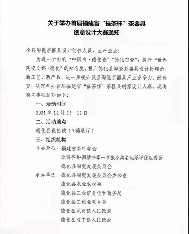 為進一步打響“中國白·德化瓷”“德化白瓷”,提升“世界陶瓷之都·德化”的知名度,推廣德化縣陶瓷茶器具設(shè)計新理念、新工藝、新產(chǎn)品,進一步提升我縣陶瓷茶器具產(chǎn)業(yè)競爭力。經(jīng)研究,決定舉辦首屆福建省“福茶杯”茶器具創(chuàng)意設(shè)計大賽,現(xiàn)將有關(guān)事項通知如下: