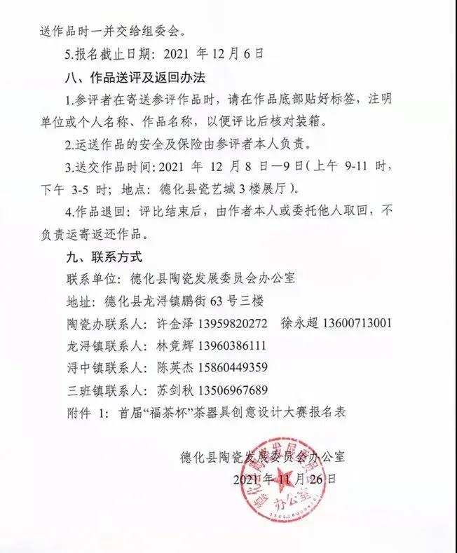 3.送交作品時間:2021年12月8日—9日(上午9-11時,下午3-5時;地點:德化縣瓷藝城3樓展廳)。