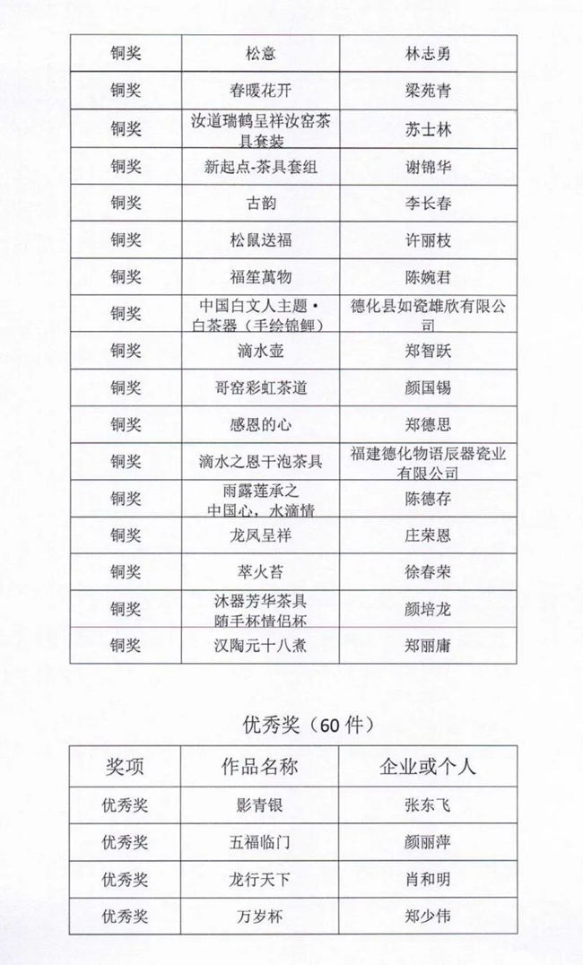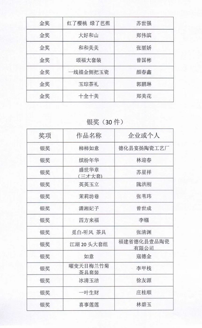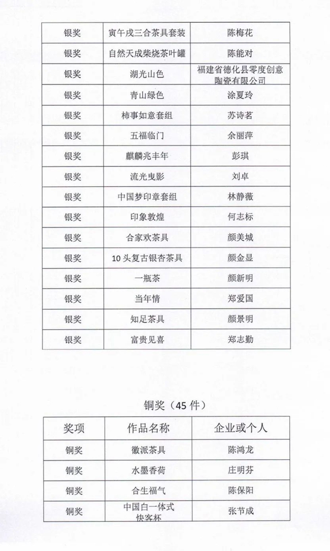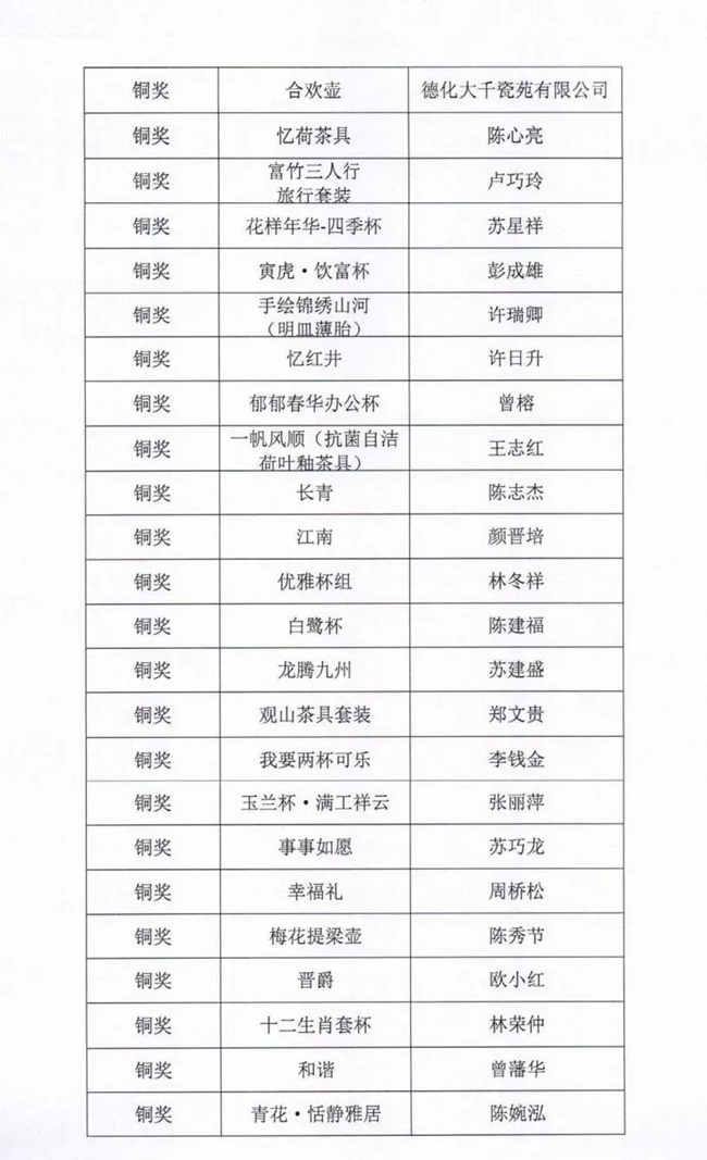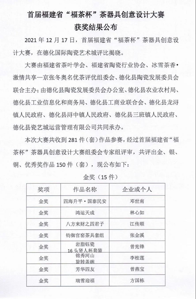 2021年12月18日,首屆福建省“福茶杯”茶器具創(chuàng)意設(shè)計(jì)大賽頒獎(jiǎng)儀式,在德化國(guó)際陶瓷藝術(shù)城舉辦。福建省政協(xié)原副主席李祖可,福建省茶葉學(xué)會(huì)名譽(yù)會(huì)長(zhǎng)、福建省人大農(nóng)經(jīng)委原副主任馮廷佺,東南亞收藏家聯(lián)誼會(huì)會(huì)長(zhǎng)陳鷹,福建省茶葉學(xué)會(huì)副會(huì)長(zhǎng)、福建省農(nóng)業(yè)廳原副廳長(zhǎng)鄒榮貴,福建省陶瓷行業(yè)協(xié)會(huì)秘書長(zhǎng)葉少芬,福建省茶葉學(xué)會(huì)常務(wù)副秘書長(zhǎng)、《福建茶葉》副主編唐輝,德化縣人民政府代縣長(zhǎng)方俊欽,德化相關(guān)鄉(xiāng)鎮(zhèn)、縣直有關(guān)單位主要領(lǐng)導(dǎo)及獲獎(jiǎng)代表共同出席頒獎(jiǎng)典禮。